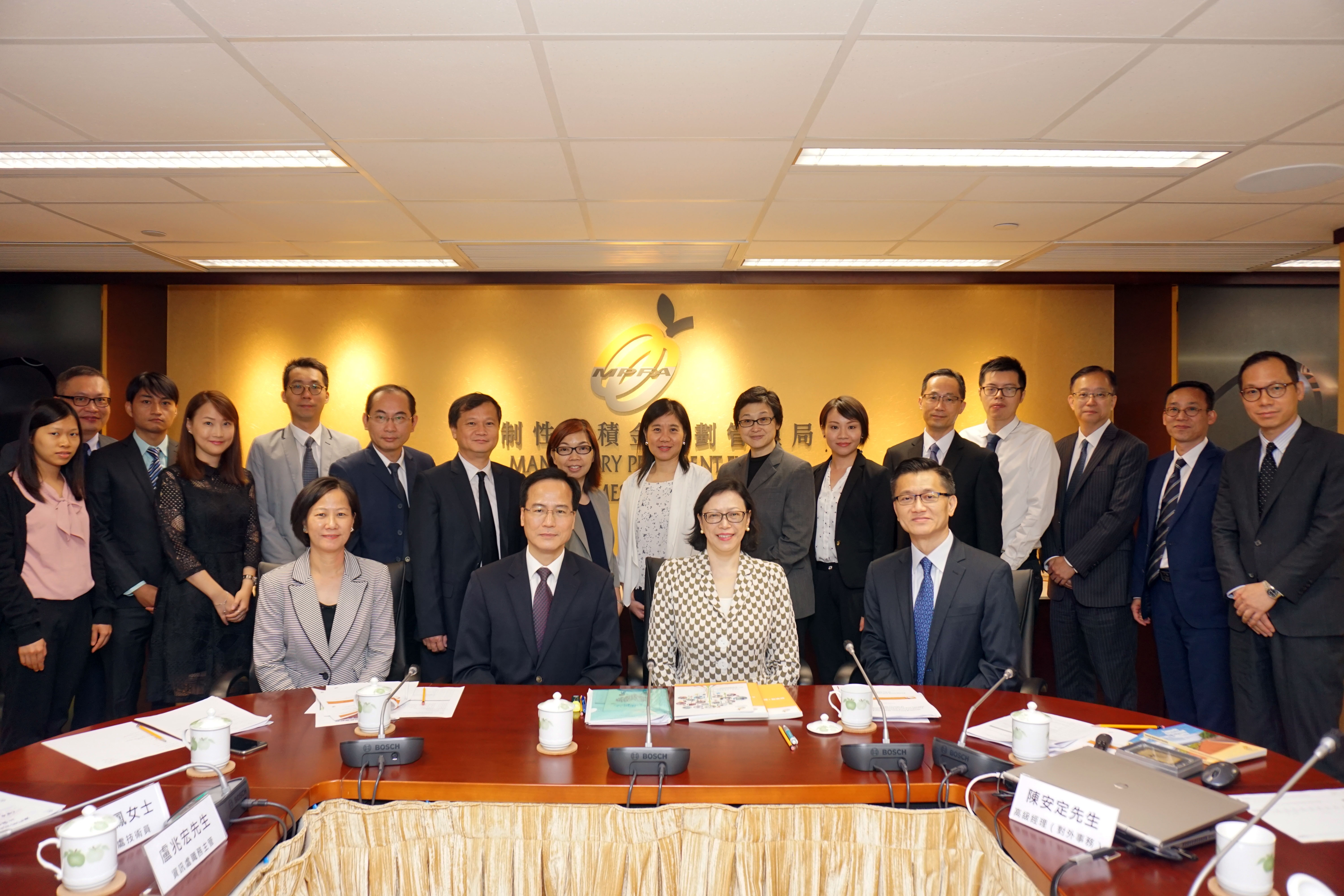 Iong Kong Io, President of the Administrative Committee of the FSS, led a delegation of 11 people to visit Hong Kong MPFA on August 15 and had a meeting with Diana Chan Tong Chee-ching, the Managing Director of MPFA, and Cheng Yan-chee, the Chief Corporate Affairs Officer and Executive Director.