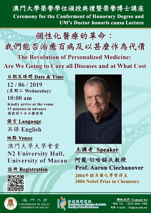 The University of Macau (UM) on Wednesday 12 June will confer a Doctor of Science honoris causa degree on Prof Aaron Ciechanover, a co-recipient of the Nobel Prize in Chemistry in 2004, in recognition of his achievements in discovering cell-controlled protein mechanism. After the ceremony, Prof Ciechanover will give a lecture titled ‘The Revolution of Personalized Medicine: Are We Going to Cure all Diseases and at What Cost’.