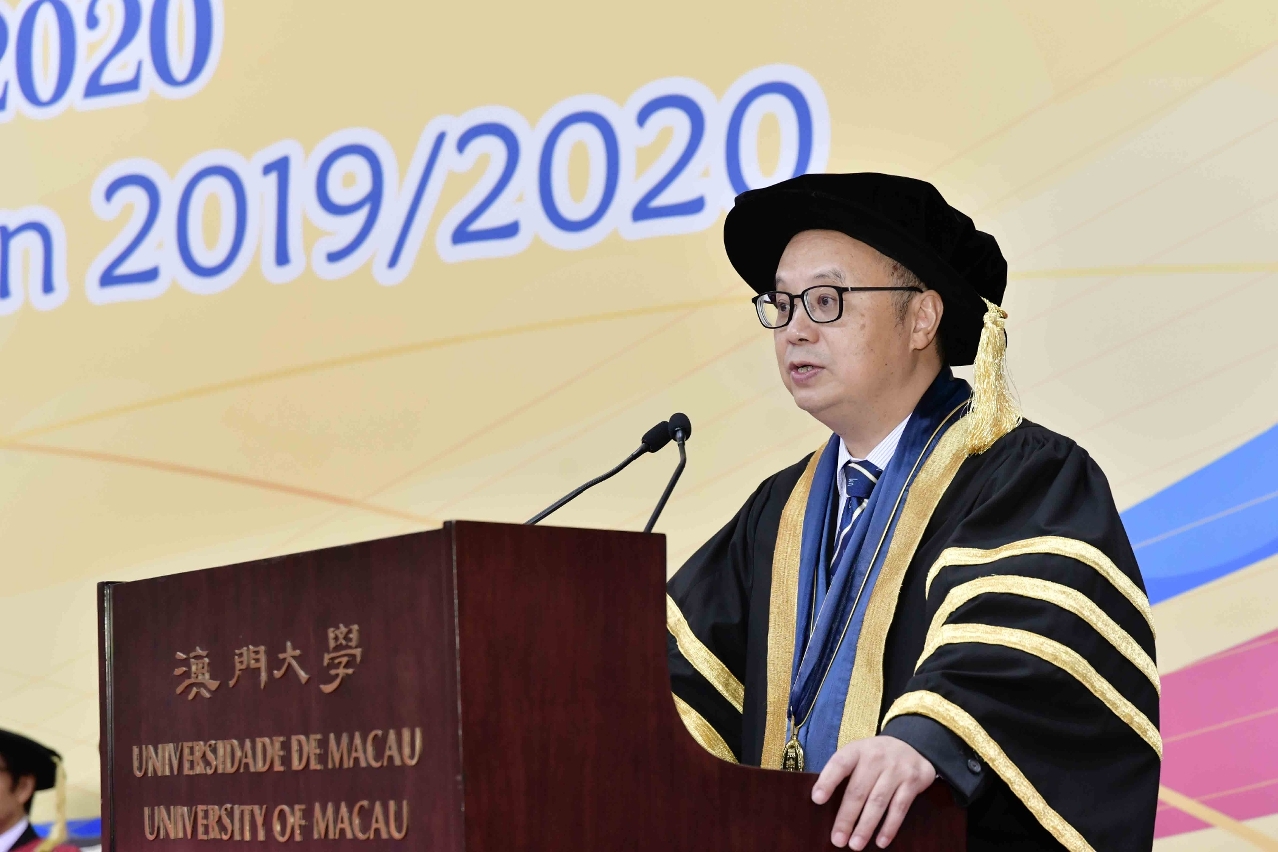 The convocation opened with a performance by the UM Symphonic Band. According to Song, this year’s convocation is special because the year 2019 marks the 70th anniversary of the People’s Republic of China and the 20th anniversary of the Macao Special Administrative Region. With the changes in higher education worldwide, innovation-driven development has become a global consensus. Therefore, missions of universities must also adapt and change as the world changes. Universities must include ‘innovation’ in higher education in order to disseminate knowledge through education, create knowledge through research, and transfer knowledge through services. Song added that to cope with the demand of the international society for high-calibre professionals, UM has also incorporated innovation in its undergraduate education by increasing the number of courses in digital education, civic participation and social experience, entrepreneurship, and leadership, in an effort to boost students’ international competitiveness.