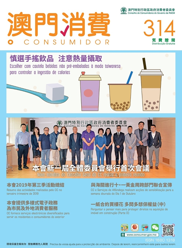 Consumer Report issue no. 314 also includes features on the recent work of the Council and other e-services of the Council. Consumers may access the magazine online on the Council’s official website and WeChat official account. Consumer Report is now also available free of charge at the Council (Av. Horta e Costa, N.º 26, Edf. Clementina Ho), and the service counter of the Council at Macao SAR Government Service Centre (Rua Nova da Areia Preta, Nº52), Public Information Centre at Vicky Plaza, libraries, and bookstores.