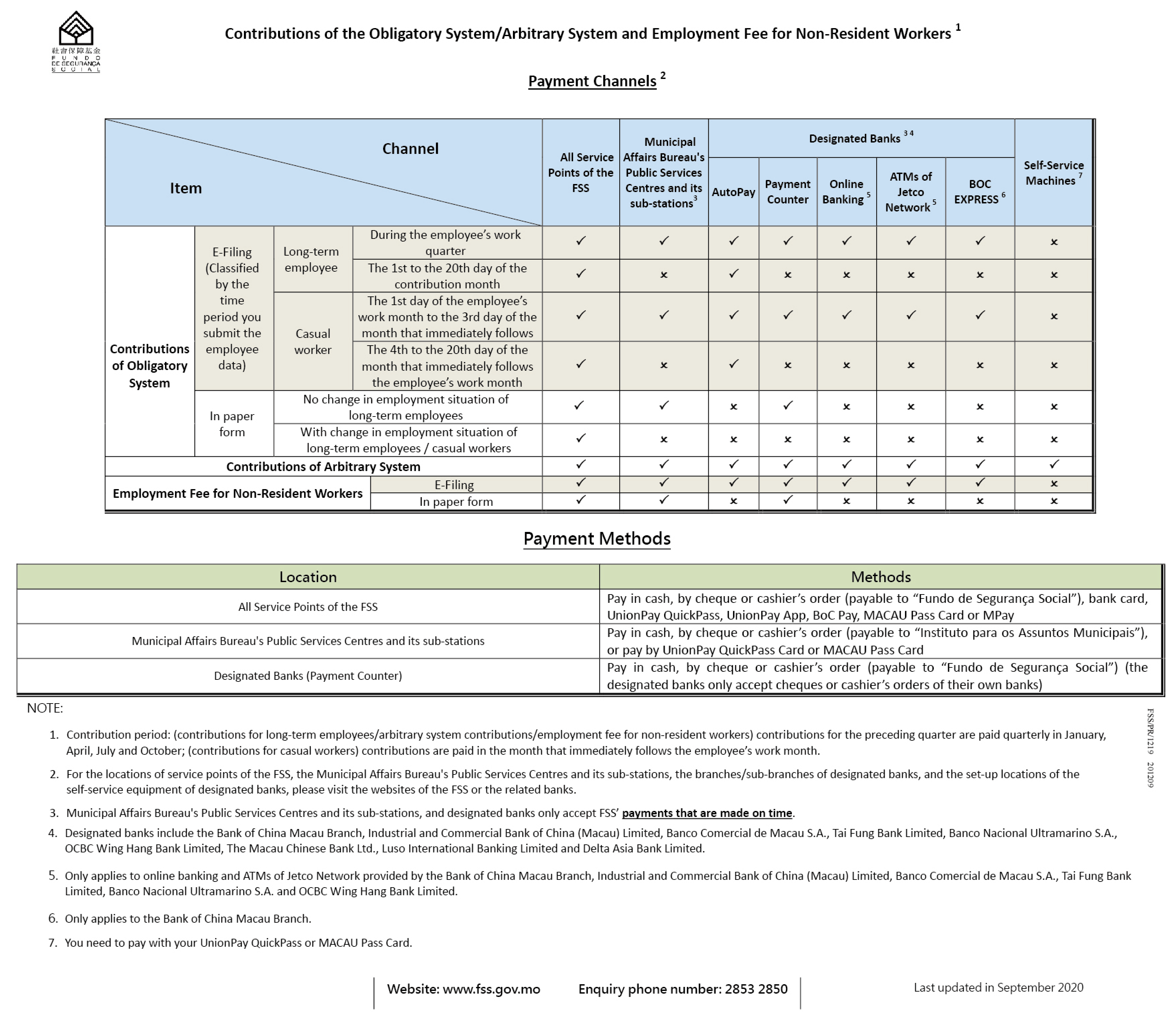 Regarding contributions of the obligatory system, employers who have applied for the use of electronic filling service are advised to use the AutoPay service as much as possible, or use the payment channels mentioned above (except self-service machines). Employers who have not yet applied for the use of electronic filing service can pay contributions and the employment fee at a service point of the FSS, and if there is no staff change of local long-term employees during the quarter, the payment can also be made at Municipal Affairs Bureau's Public Services Centres and sub-stations, or at the payment counters of designated banks.