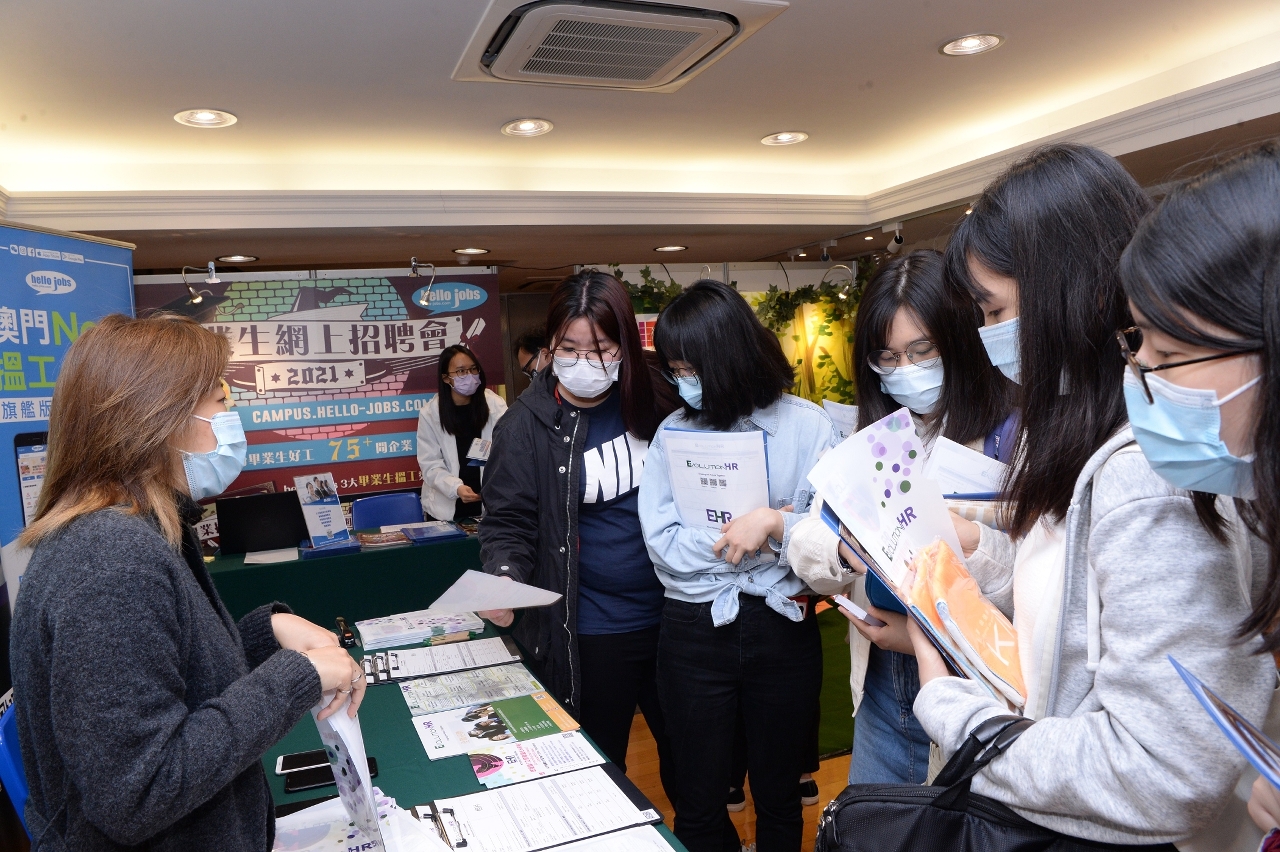 The participating organisations of “Careers Day 2021” include: Direcção dos Serviços de Administração e Função Pública, Economic and Technological Development Bureau, Labour Affairs Bureau, Social Security Fund, Sociedade de Jogos de Macau S.A., Wynn Resorts (Macau) Limited, Galaxy Entertainment Group, MGM, Melco Resorts & Entertainment, Sands China Ltd., Four Seasons Hotel Macao, Cotai Strip, Lisboeta Macau, Macau Fisherman’s Wharf, Artyzen Grand Lapa Macau, L’Arc Macau, Regency Art Hotel, Grand Coloane Resort, Suncity Group Ltd., Tak Chun Group, Bank of China Limited Macau Branch, Industrial and Commercial Bank of China(Macau) Limited, China Construction Bank Corporation Macau Branch, Luso International Banking Ltd, Tai Fung Bank Limited, Banco Delta Asia S.A., China Guangfa Bank Macau Branch, PricewaterhouseCoopers, Zung Fu Motors (Macau) Limited, Centaline Macau Enterprise Limited, Haoliwoo Real Estate Of Network, Ltd, Ricacorp (Macau) Property Agency Limited, Savills (Macau) Limited, Companhia de Telecomunicações de Macau S.A.R.L., MTel Telecommunication Company Limited, Netcraft Information Technology (Macau) Co., Ltd., Yonyou Software(Macau)Co.,Ltd., International Alliance Systems Limited, Boardware Information System Limited, LT (Macau) Limited, Macau 853 Mask Factory, Loksophy Design Ltd, Manner Culture Ltd., New Yaohan, Richemont Asia Pacific, Sa Sa Cosmetic Company Limited, The Dairy Farm Company, Limited - Macau Branch, McDonald’s Macau, Macau Greater Bay Area Human Resources Association, EvolutionHR Consultancy Limited, JC Human Resources Consulting (Macau) Company Limited, MSS Recruitment, hello-jobs.com, AXA China Region Insurance Company (Bermuda) Limited, and Manulife (International) Limited。Zhuhai Hengqin New Area Elites Human Resource Service Co., Ltd, Sanjiang Human Resource Service Company, Nansha Youth Federation of Guangzhou, Guangzhou Nansha Economic and Technology Development Zone Commercial Bureau, Institute of Industry Technology Guangzhou, Guangzhou Institute of Advanced Technology, Institute of Software Application Technology, Guangzhou & Chinese Academy of Sciences, HKUST Fok Ying Tung Research institute, China Merchants Bank Co., Ltd. Guangdong Pilot Free Trade Zone Nansha Branch, Nansha Investment Development Co., Ltd. of China Railway Construction Co., Ltd., Guangqi Toyota Engine Co., Ltd, Lonza Guangzhou Nansha Ltd., Just U (G.Z.) Technology Co. Ltd., Guangdong Chengzhi Law Firm, Guangzhou Zeale Group Co., Ltd, Guangzhou Bay Area Insurance Sales Co., Ltd, Grandlex & PMT Law Firm, Iflytek South China Artificial Intelligence Research Institute, South China Technology Commercialization Centre, China Railway Tunnel Group Co., Ltd., APT Electronics Co., Ltd., and Guangzhou Nanshawan Real Estate Management Co., Ltd.