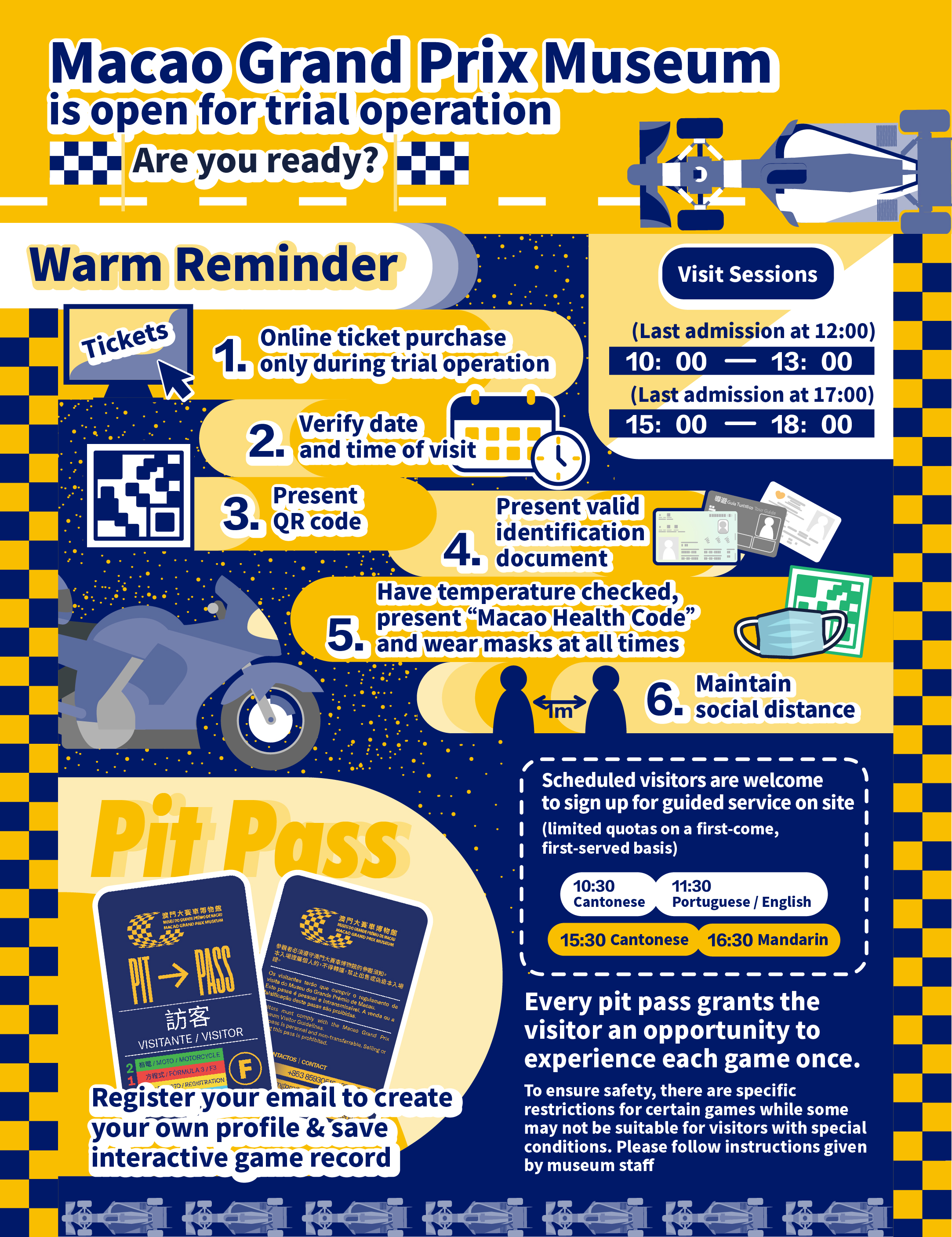During trial operation, the Museum provides daily sessions of public guided service. Visitors are welcome to sign up on site for the guided service session conducted in their preferred language at designated time slots. Due to limited quotas, the guided service will be signed up on a first-come, first-served basis. The Macao Grand Prix Museum rigorously follows the pandemic prevention guidelines issued by Health Bureau. Visitors are required to wear masks throughout their visit, have their temperature checked and present Macau health code of the day upon entry.