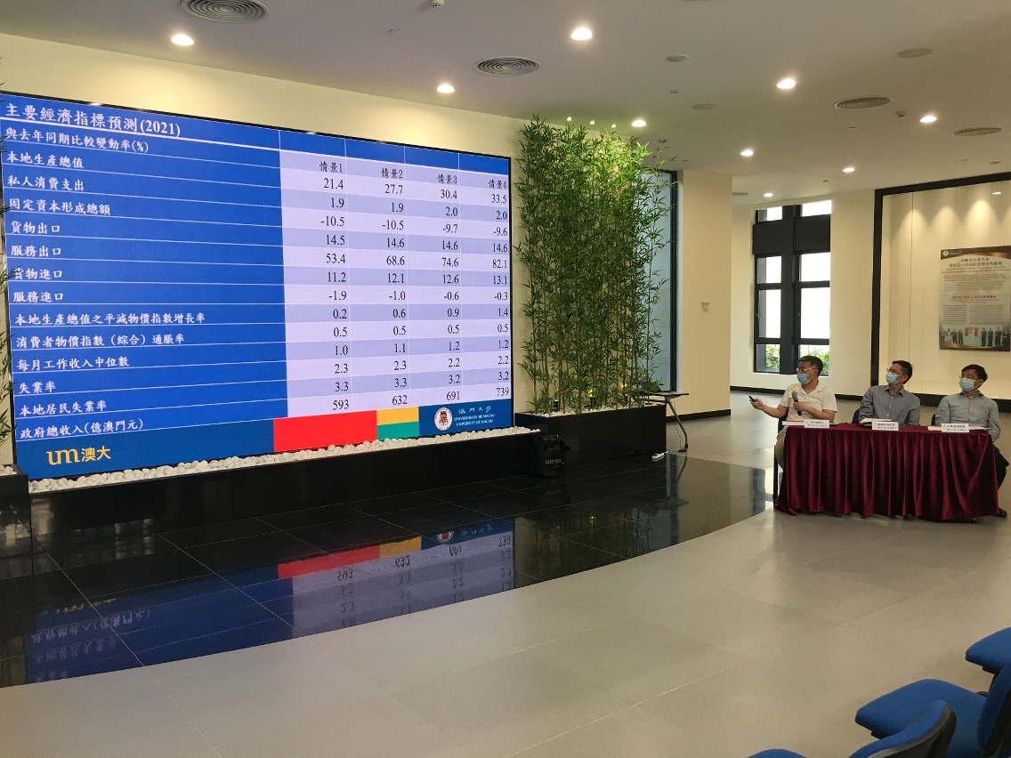 The University of Macau’s (UM) Centre for Macau Studies and Department of Economics today (7 April) released the 2021 Macao Macroeconomic Forecast. According to the forecast, the baseline forecast of Macao’s economic growth are between 21.4 per cent and 33.5 per cent; the baseline forecast of the growth in the exports of services are between 53.4 per cent and 82.1 per cent; the unemployment rate is projected to decline; government revenue (reimbursement from government reserve excluded) is projected to be between MOP 59.3 billion and MOP 73.9 billion.
