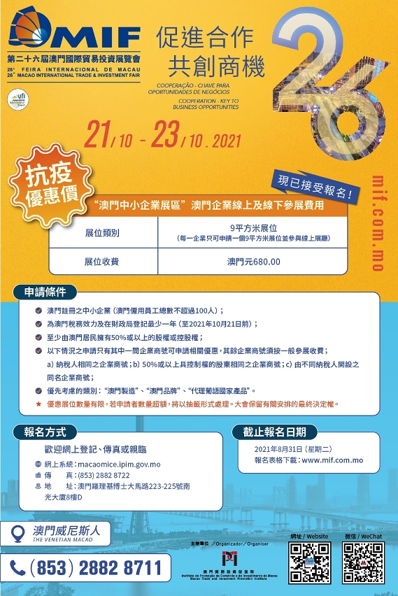 The 26th Macao International Trade & Investment Fair (26th MIF), organised by the Macao Trade and Investment Promotion Institute, will be held at The Venetian Macao from 21 to 23 October. This year’s MIF will once again set up the “Macao SME Pavilion” and provide eligible local companies with an anti-epidemic discount: a participation fee of MOP680, assisting SMEs in their upgrading and transformation and boosting the economy in the post-pandemic era. Interested companies are welcome to apply from today (23 August) to 31 August.