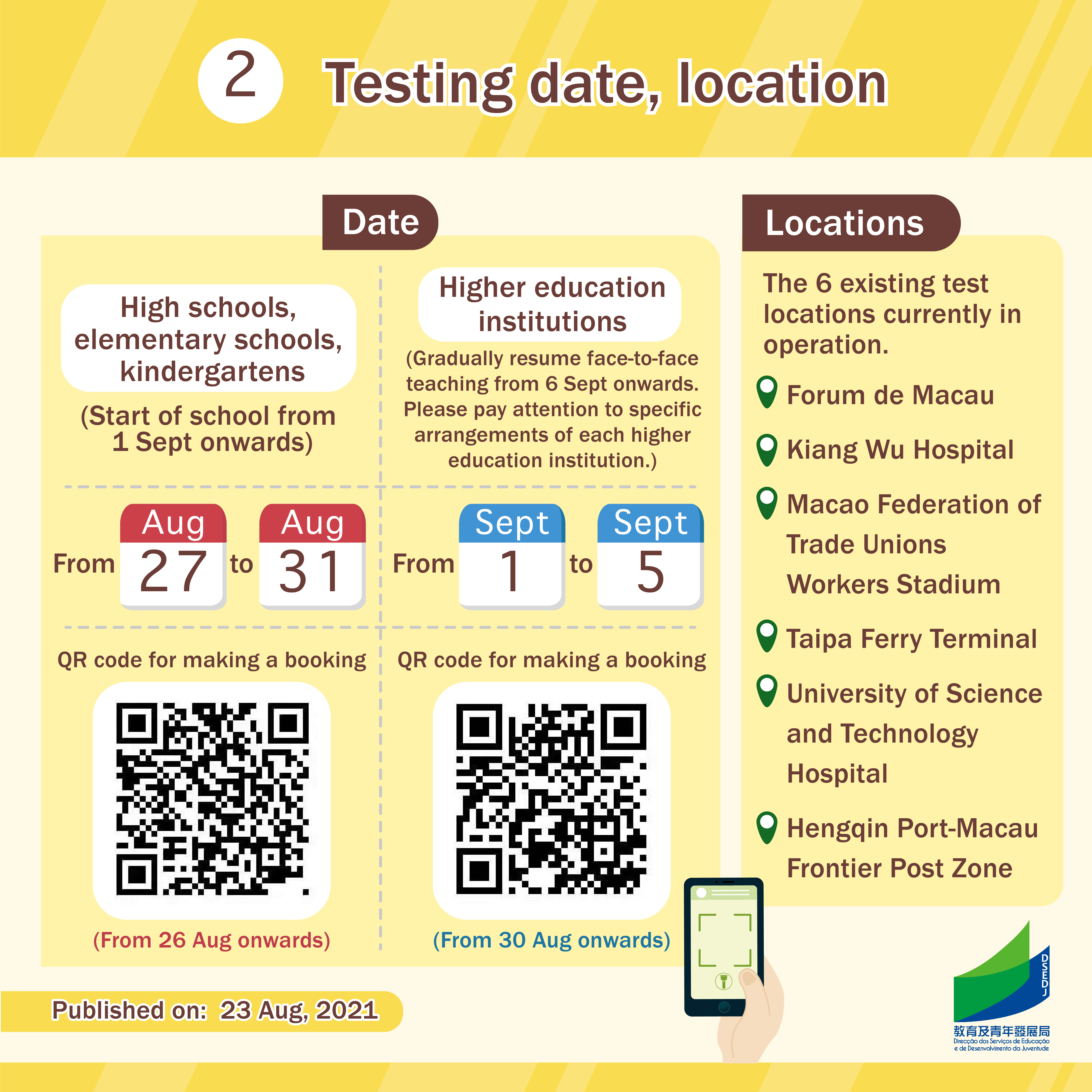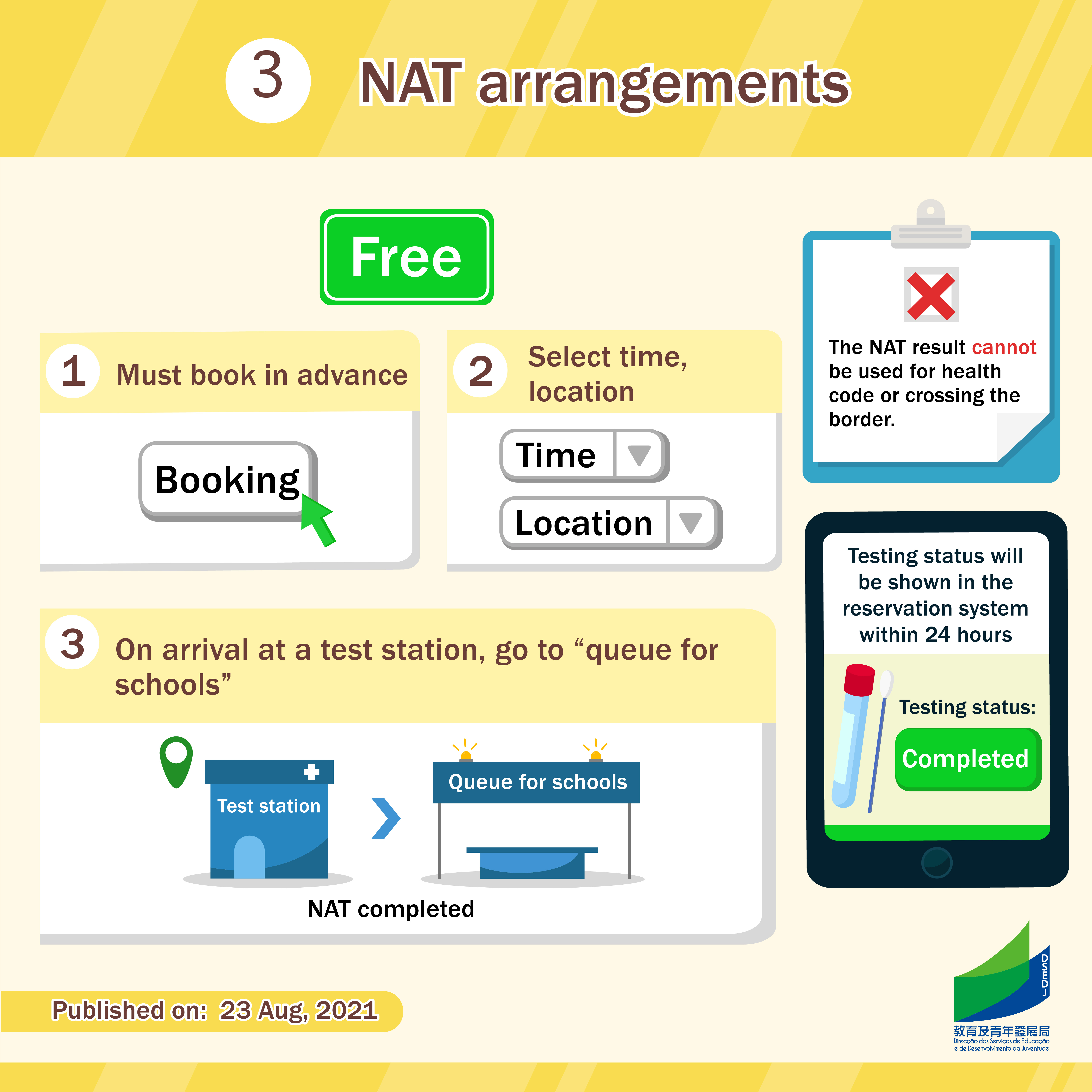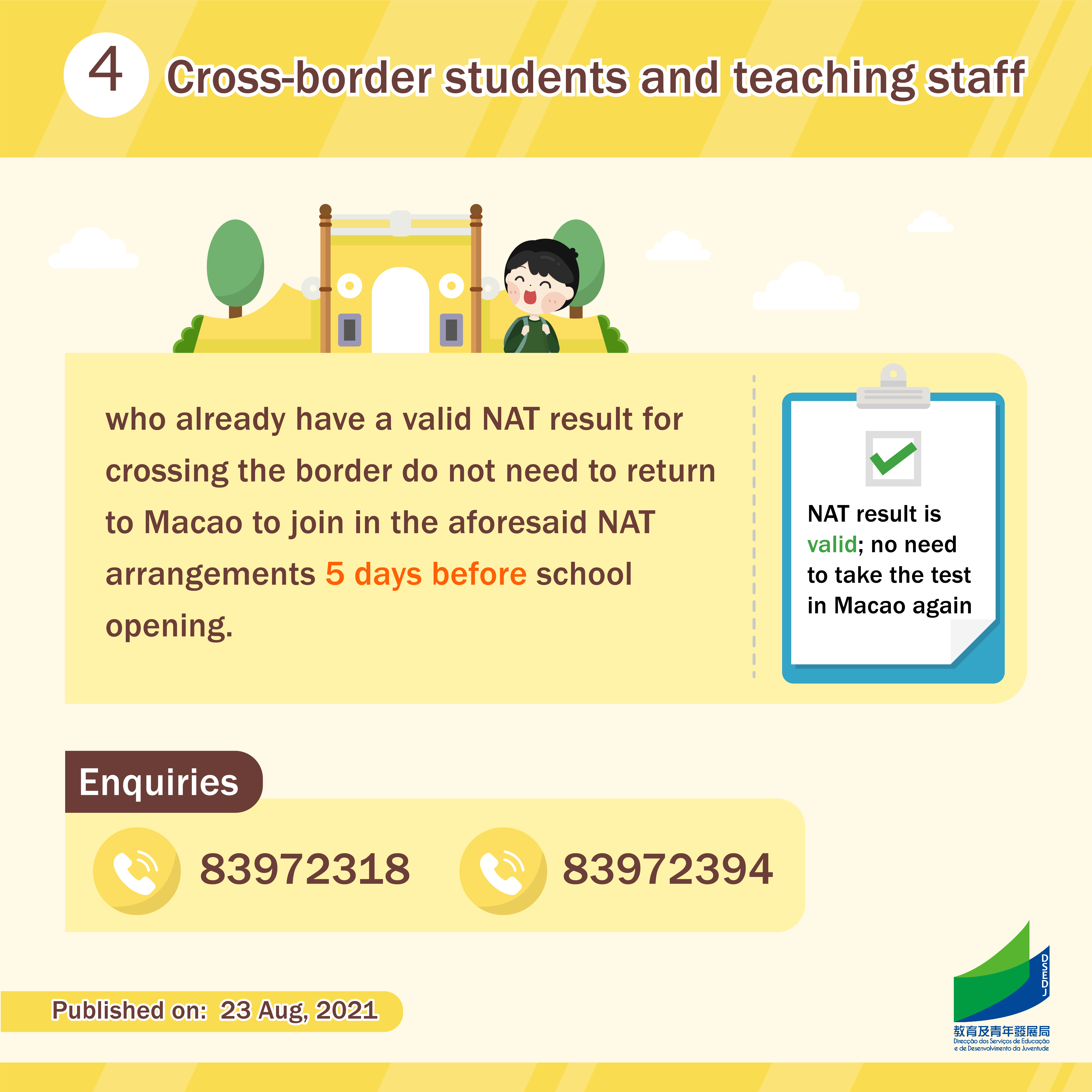 To ensure that the new school year can start safely as scheduled, safeguard students’ health, the DSEDJ and health departments will adopt the epidemic prevention measures for the start of school with higher standards and make adjustments to the preliminary plan. Some students and teaching staff will be requested to undergo a nucleic acid test 5 days before school opening or resumption of face-to-face teaching. The target groups are students and teaching staff who personally, or whose housemates, have been to places outside Macao, Zhuhai, Zhongshan after 6 Aug. Such students and teaching staff must show a screenshot indicating that the nucleic acid test is completed when returning to school.