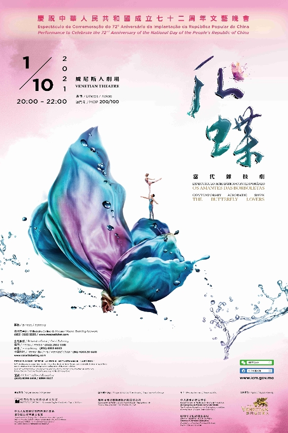 The “Performance to Celebrate the 72nd Anniversary of the National Day of the People’s Republic of China” - Contemporary Acrobatic Show “The Butterfly Lovers”, jointly organized by the Cultural Affairs Bureau of the Macao SAR Government and the Department of Publicity and Culture of the Liaison Office of the Central People’s Government in the Macao SAR, produced by the Publicity Department of Guangzhou Municipal Committee of Chinese Communist Party and the Guangzhou Municipal Bureau of Culture, Radio, Film and Tourism, supported by The Venetian Macao, and performed by the Guangzhou Acrobatic Arts Theater Co., LTD, will be held on October 1st, at 8pm, at Venetian Theatre, allowing the public to enjoy an exquisite acrobatic show while celebrating the National Day. Tickets will be on sale from September 21st (Tuesday) at the Macau Ticketing Network and Cotai Ticketing.