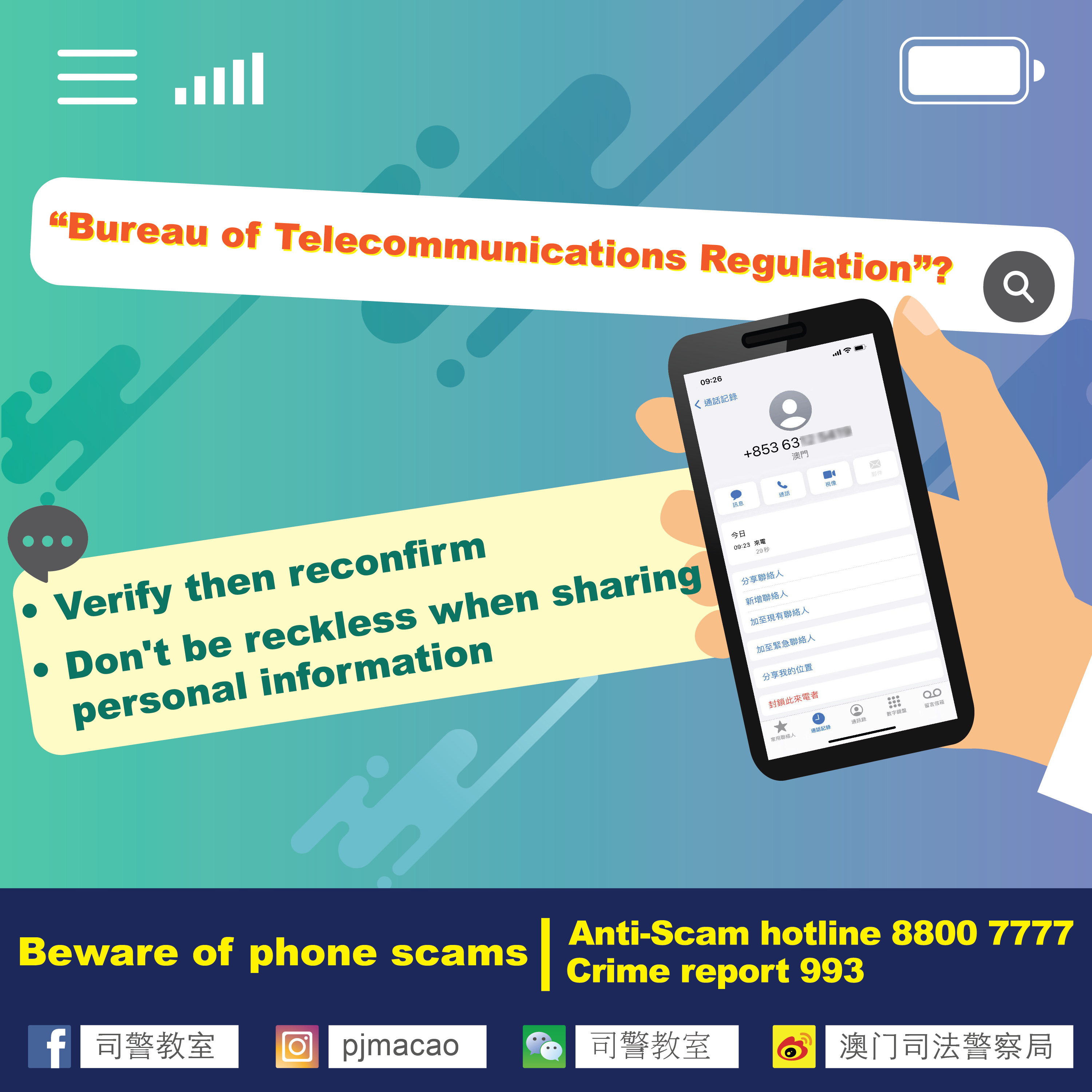 - If you suspect you have fallen prey to scam or would like to share any crime intelligence with the police, please contact the Judiciary Police via the Anti-scam hotline 8800 7777 or crime report hotline 993.