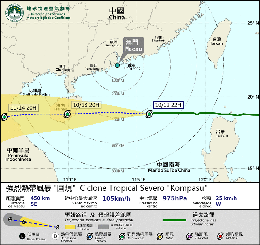 Kompasu is moving across the northern part of the South China Sea. It will come closest to Macao between midnight and morning on the 13th, at a distance of around 400km south to Macao. It will move in the general direction to Hainan Island. Due to the approaching of Kompasu, the local weather will become unsettled with heavy, frequent showers and thunderstorms. Winds will intensify significantly during 13th early morning. The maximum wind will reach wind force level 8 – 9, with gusts. The wind direction will change from northerly, to northeasterly and easterly. The public should pay attention to the change in the prevailing wind direction.
