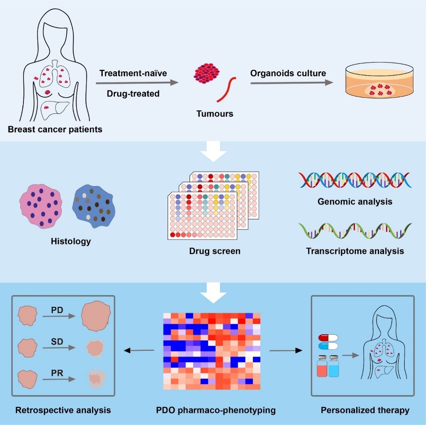 The results showed that breast cancer PDOs could preserve the biological characteristics of primary tumours. PDO pharmaco-phenotyping showed striking variability in the PDO response to the drug treatment. The PDO chemosensitivity profile largely paralleled the retrospective clinical data of the corresponding patients. Finally, PDOs were applied to guide personalised therapy for six patients with advanced cancer, all of whom showed good responses. Based on the above findings, the team proposed a novel precision treatment strategy for breast cancer based on drug screening of PDOs, which is a new direction for cancer precision medicine with important clinical significance.