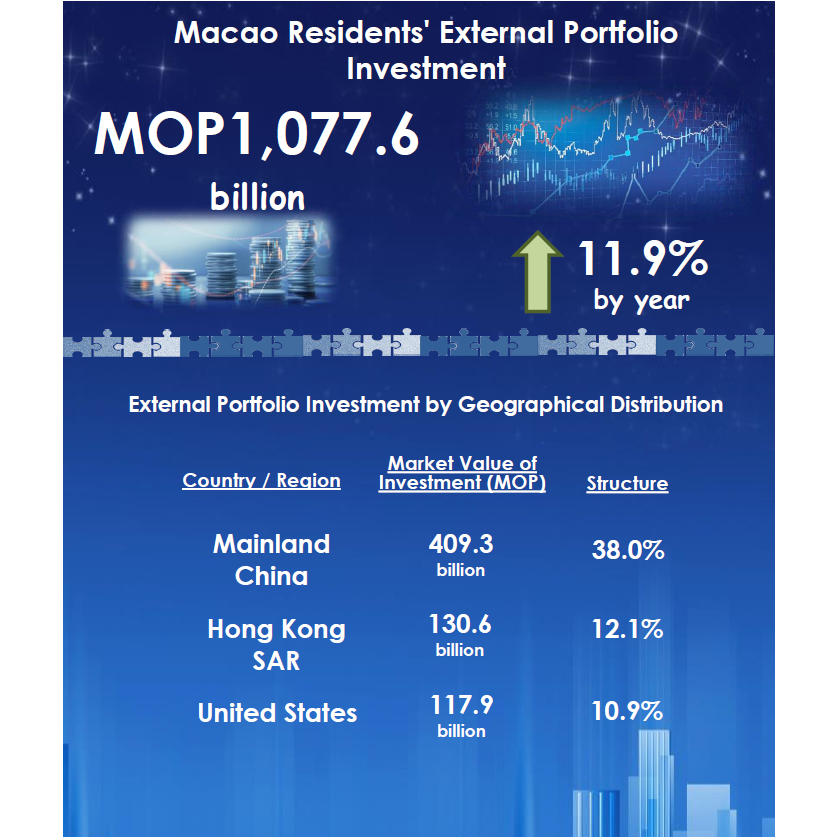 Macao residents’ portfolio investment in the North Atlantic and Caribbean continued to increase. The market value of investment in this region rose by 5.5% from end-2020 to MOP187.0 billion while its share in total external securities investment increased from 17.3% to 17.4%; the market value of portfolio investment in the Cayman Islands grew by 7.5% to MOP96.9 billion.