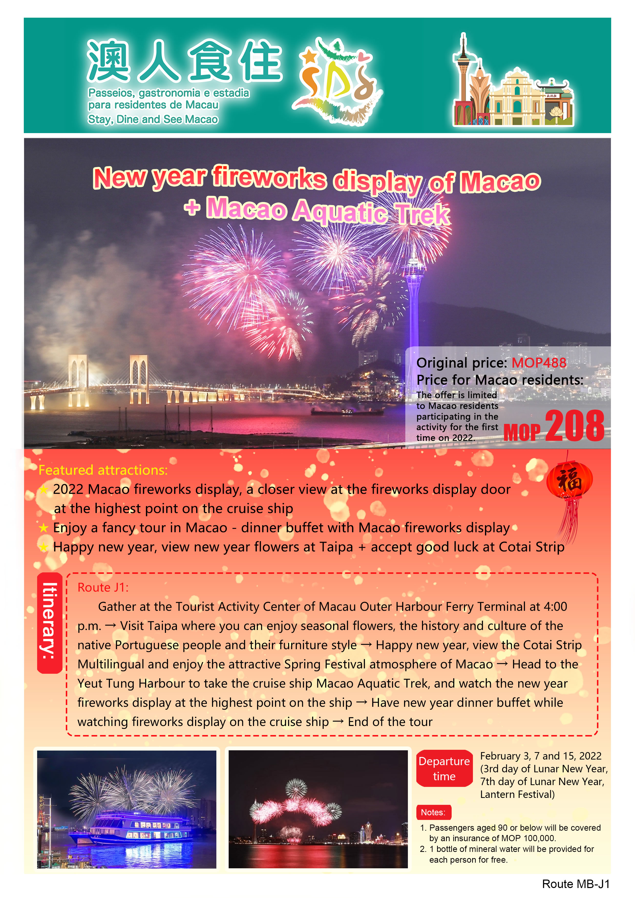 Enjoy fireworks on cruise – participants can have buffet dinner on Macau Cruise while enjoying fireworks in a close distance for the captivating impact. They can also enjoy the sight of festive-seasonal flowers at the Taipa Houses, one of Macao’s eight scenic spots, and learn more about Macanese culture at the Taipa Houses Museum.