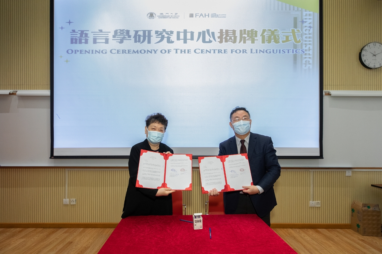 The University of Macau (UM) recently held a plaque unveiling ceremony for the Centre for Linguistics. The establishment of the centre marks the university’s efforts to promote research studies across different language disciplines and its contributions to the development of linguistics in Macao. After the ceremony, representatives of UM’s Faculty of Arts and Humanities (FAH) and the Macao Linguistics Society signed a collaboration agreement on the publication of the Macao Journal of Linguistics.