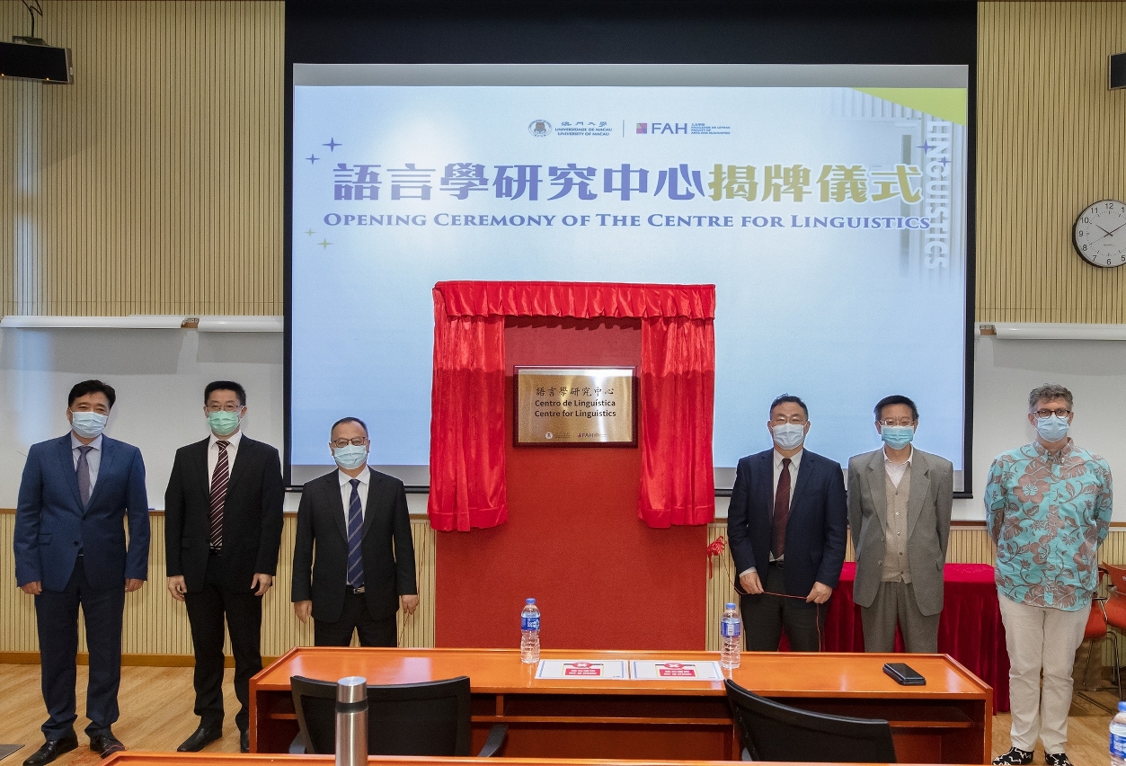 Yonghua Song, rector of UM; Xu Jie, dean of the FAH and director of the Centre for Linguistics; Li Defeng, associate dean of the FAH and director of the Centre for the Studies of Translation, Interpreting and Cognition; Wang Qingjie, associate dean of the FAH; Yuan Yulin, chair professor of the Department of Chinese Language and Literature; and Andrew Moody, associate director of the Centre for Linguistics and associate professor in the Department of English, officiated at the plaque unveiling ceremony. Attendees of the ceremony also included Victoria Lei and Joaquim Kuong, assistant deans of the FAH, as well as other UM Faculty members, students, and members of the academic circle.