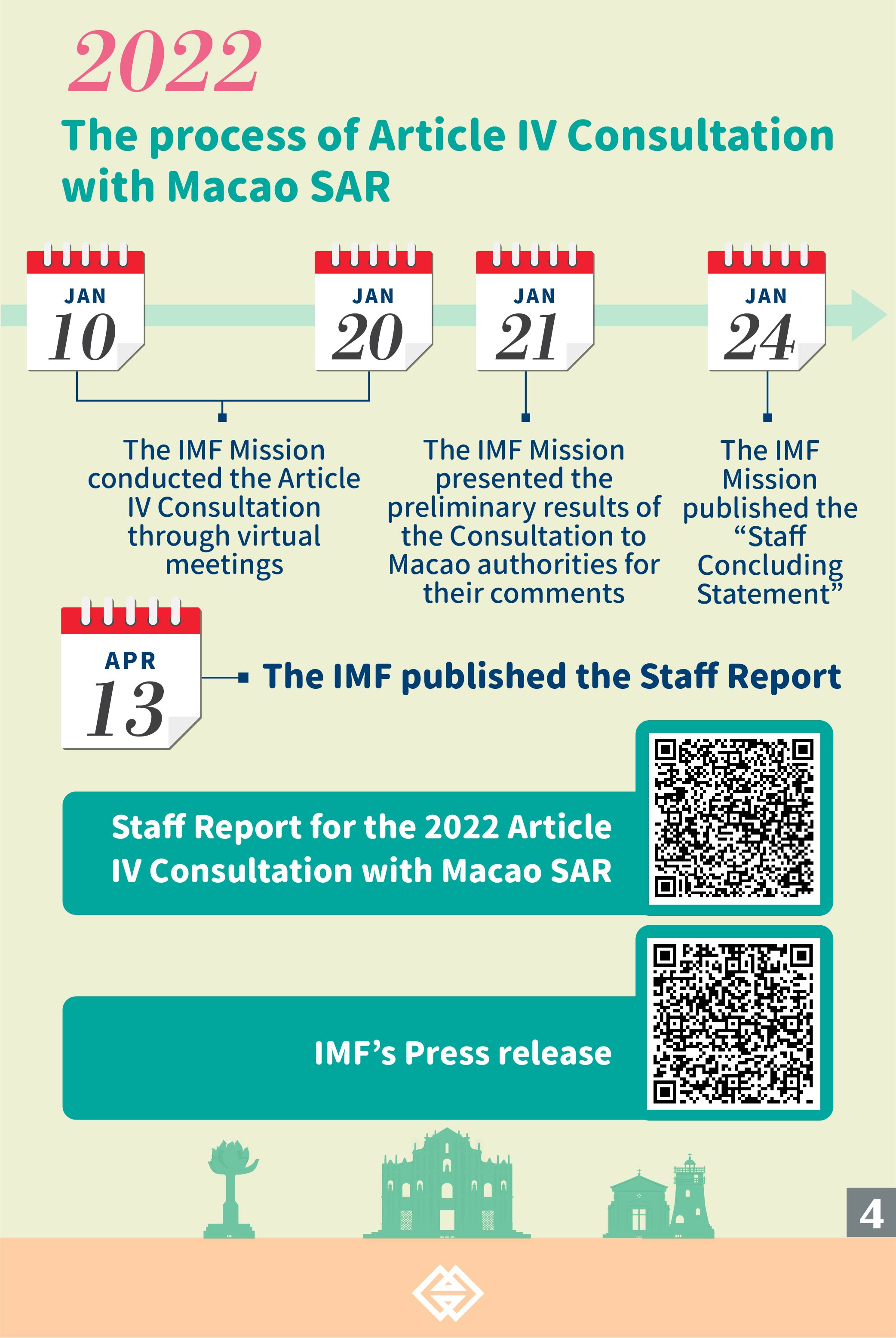 The Staff Report (https://www.imf.org/en/Publications/CR/Issues/2022/04/12/Peoples-Republic-of-China-Macao-Special-Administrative-Region-2022-Article-IV-Consultation-516538) and the relevant press release (https://www.imf.org/en/News/Articles/2022/04/12/pr22116-imf-executive-board-concludes-article-iv-consultation-macao-special-administrative-region) have been published in the IMF website. The next IMF Article IV Consultation with Macao SAR will take place on the standard 24-month cycle.