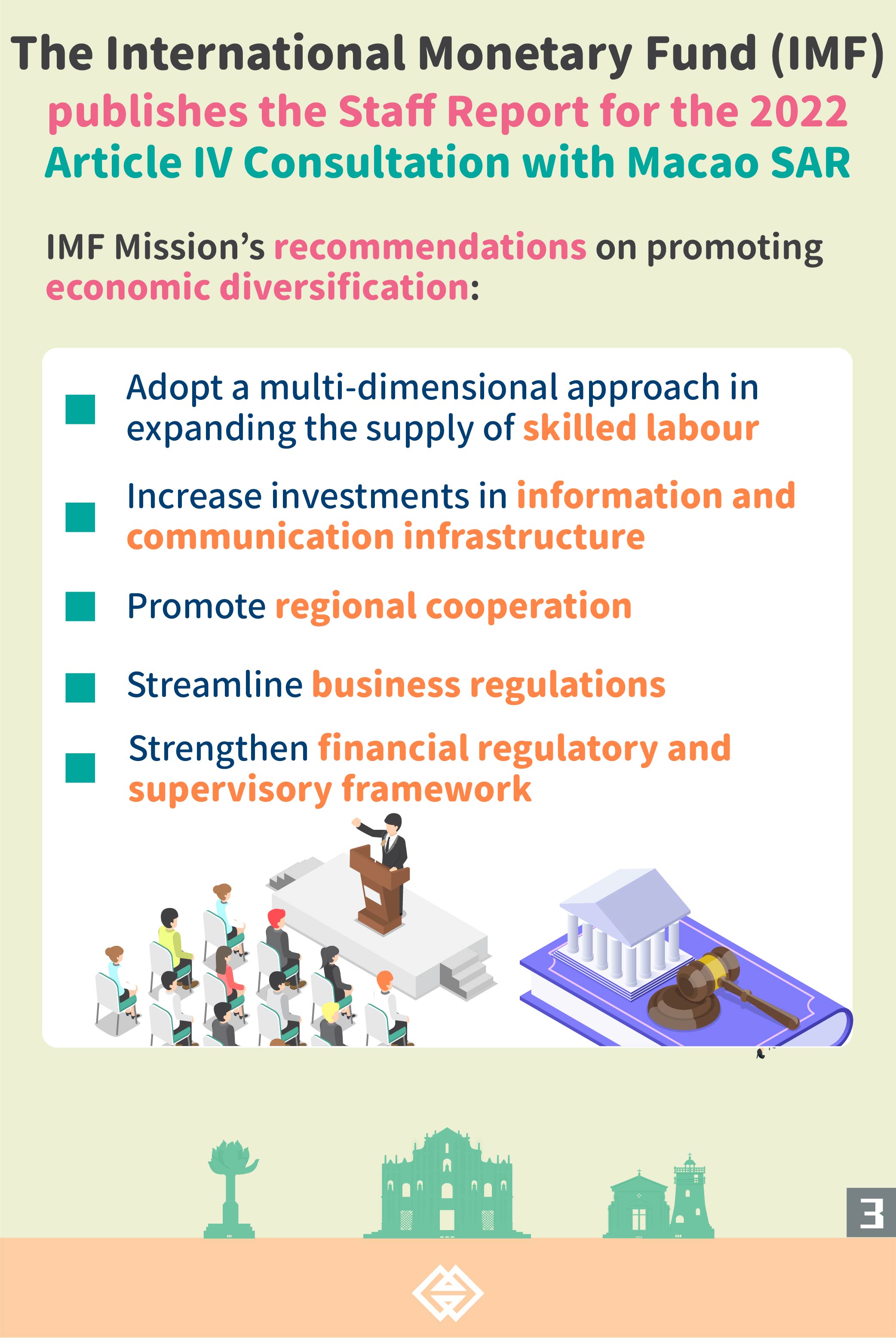 The IMF concurs Macao SAR’s economic diversification policies, which will enhance the economy’s resilience if implemented well. Meanwhile, it recommends a multi-dimensional approach in expanding the supply of skilled labour to advance economic diversification, increasing investments in information and communication technology infrastructure, promoting regional cooperation and streamlining business regulations.