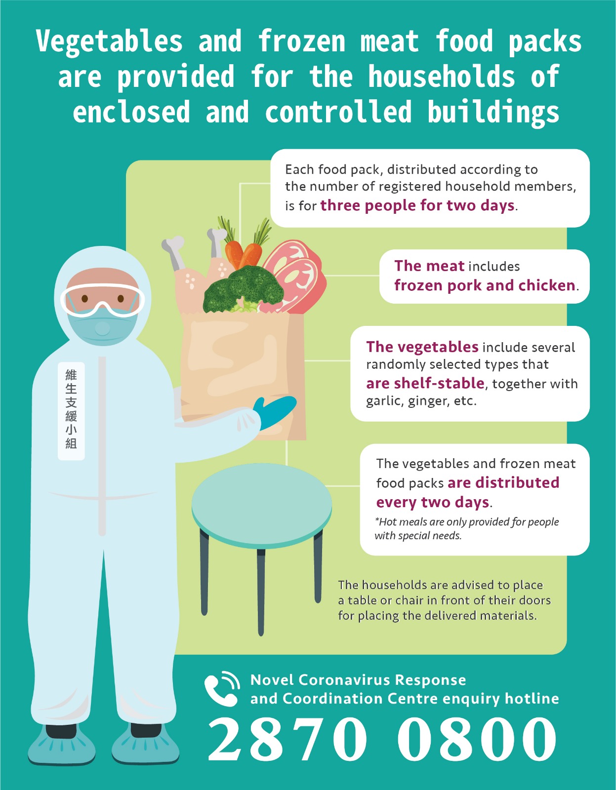 Each food pack, distributed according to the number of registered household members, is for three people for two days, mainly containing vegetables and frozen meat for daily consumption, such as frozen pork, chicken and other meats, as well as potatoes, cabbage and other semi-perishable vegetables, together with garlic, ginger, etc. In order to reduce personal contact, the food packs are distributed every two days. Relevant households are advised to place a table or chair in front of their doors for placing the food packs and other necessities.