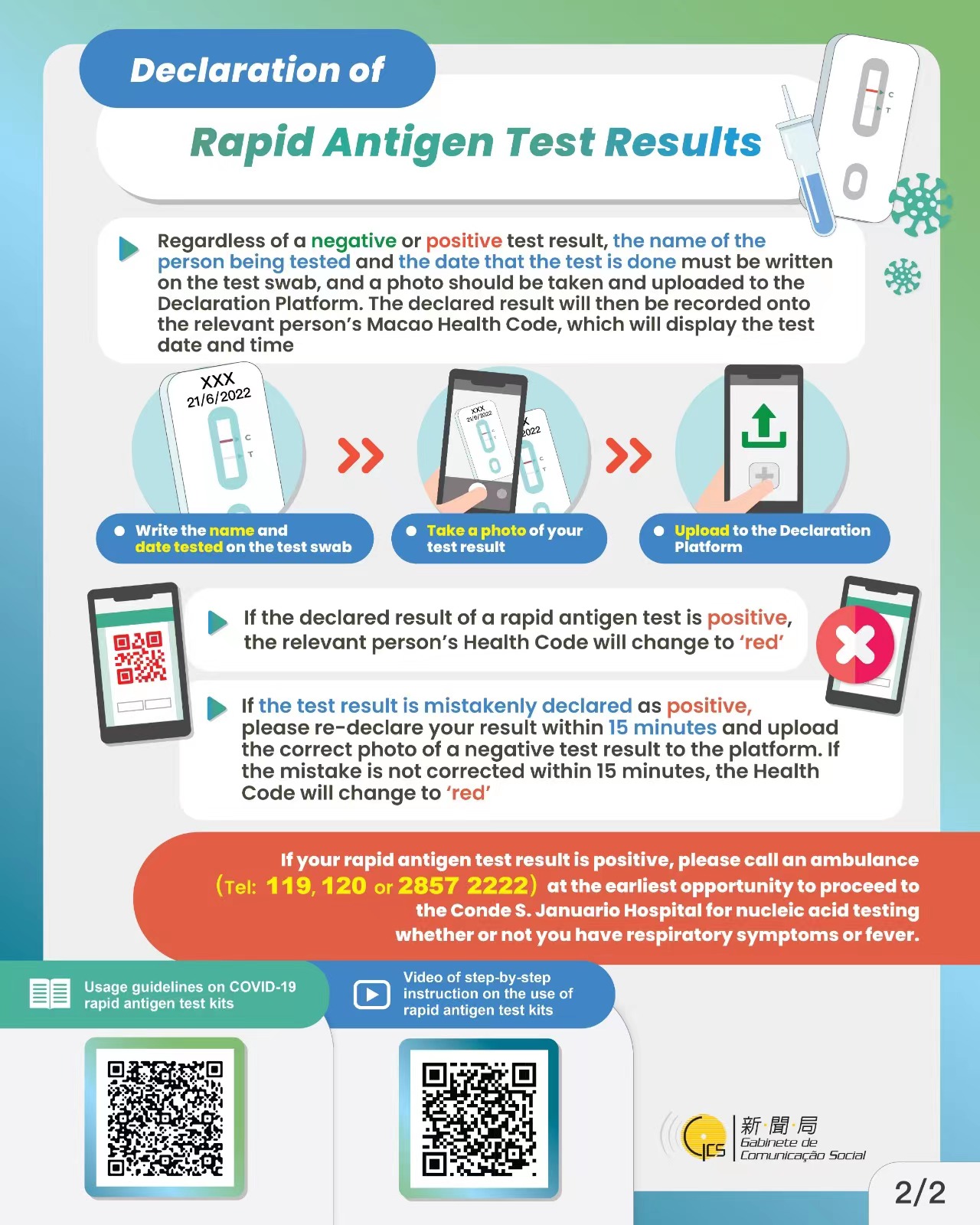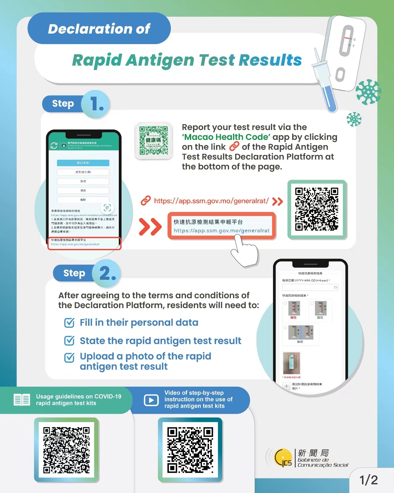 The Centre says that sampling in the above NAT stations have been performed in strict compliance with the anti-epidemic guidelines. At present, all the stations have been cleaned and disinfected and remain in operation. Citizens who went to get tested at the above locations and times need not worry, but should manage their own health properly, conduct rapid antigen self-test once within two days following their sampling and upload the test result to the designated platform. If feeling unwell, visit the emergency service of hospital for medical attention. For more information on rapid antigen self-test, please refer to the dedicated website: https://www.ssm.gov.mo/apps1/covidagtest/ch.aspx#clg21988