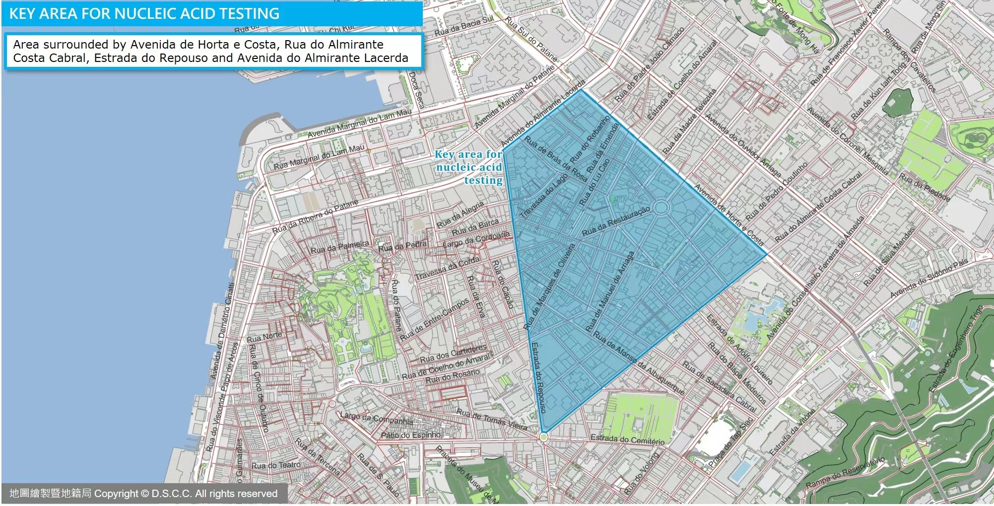 - Targets of key areas testing include: Individuals who live, work or have activities in the area encircled by Avenida de Horta e Costa, Rua do Almirante Costa Cabral, Estrada do Repouso, Avenida do Almirante Lacerda, that is, individuals who have been at the aforementioned locations for a total period of more than one hour on or after 16 June.