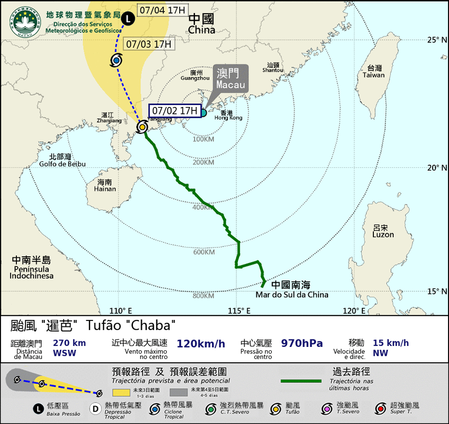 Typhoon “Chaba” made landfall near Maoming at 4 p.m. . As “Chaba” gradually weaken after landing and move inland. SMG will consider to issue the Tropical Cyclone Warning Signal No.3 between 7 p.m. and 10 p.m. depending on the situation. However, under the sustainable influence of broad circulation of “Chaba”, occasionally heavy showers and thunderstorms, with wind force level 5 - 6 and gusts are expected in Macao in these two days.