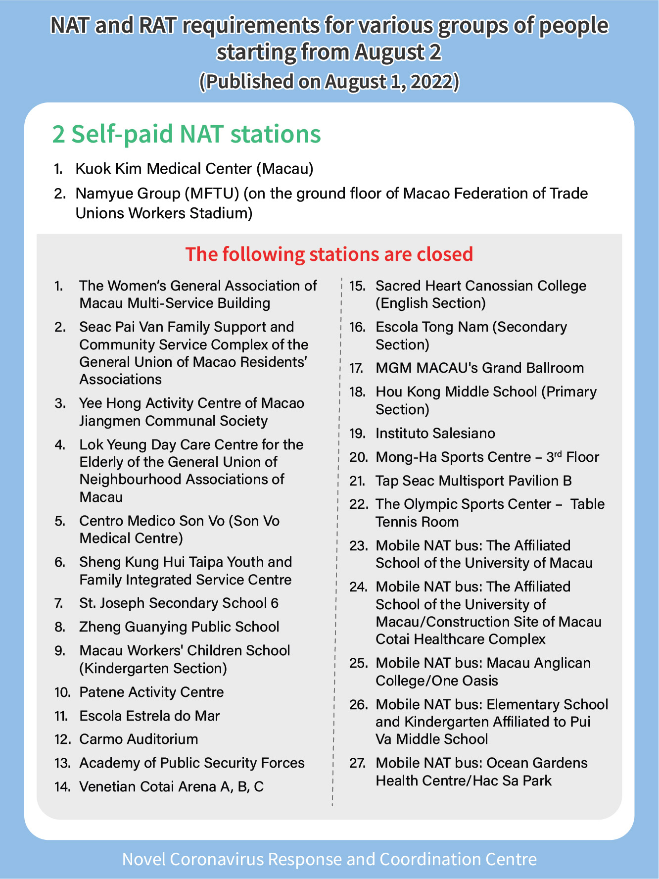 The Novel Coronavirus Response and Coordination Centre announces that after risk analysis, starting tomorrow (2 August, Tuesday), the nucleic acid testing (NAT) arrangement for key groups and those who need to leave home for work will be adjusted as follows: