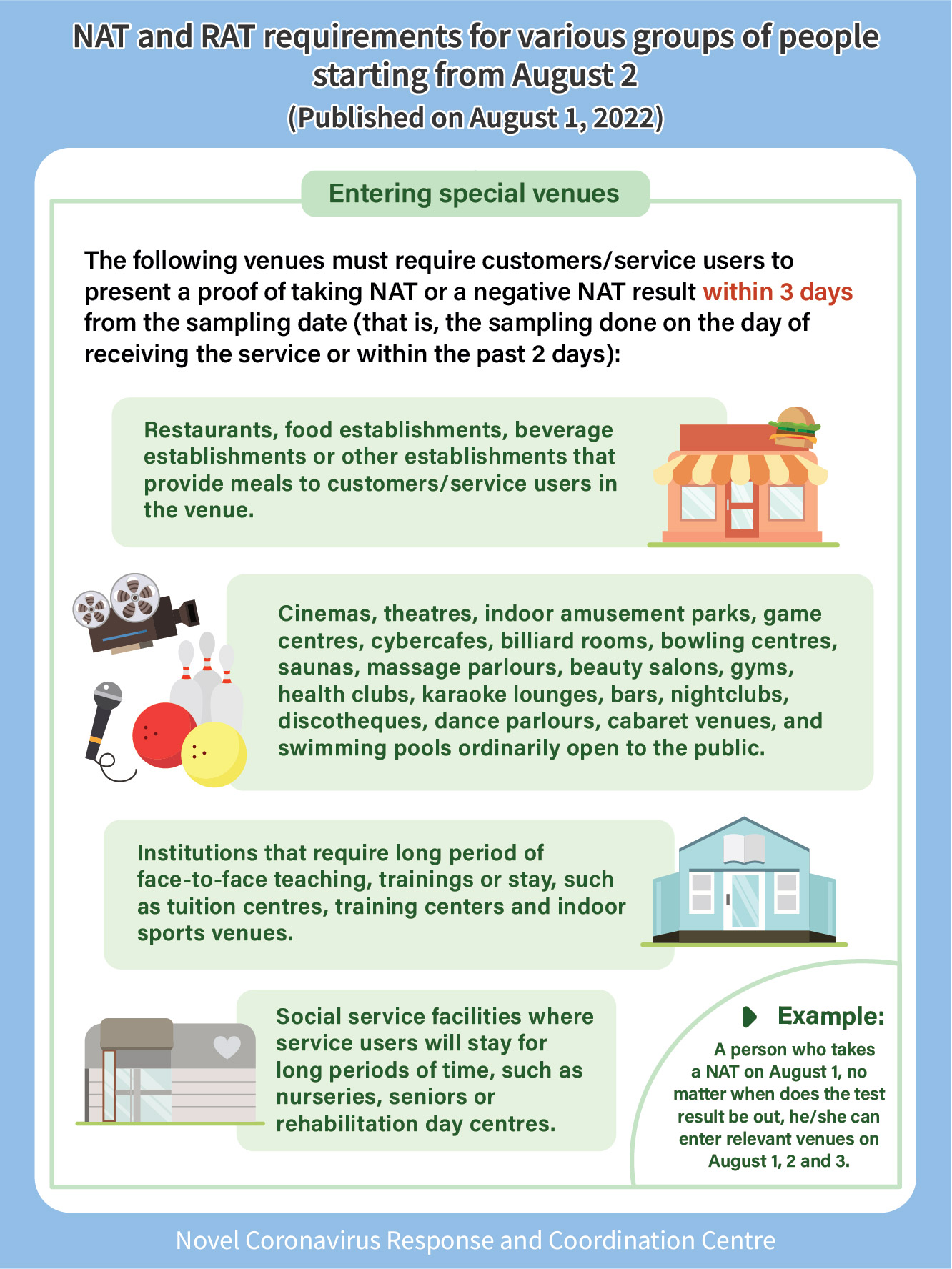 Upon entry into the specified venues below, customers/service users shall be required to present proof of negative result or proof of sampling for COVID-19 nucleic acid test within 3 days (i.e. having a nucleic acid test on the day of receiving the service or within the past two days). For example, if one has undergone sampling on 1 August, he/she will be allowed to enter relevant venues on 1, 2 and 3 August, regardless of when the result is out: