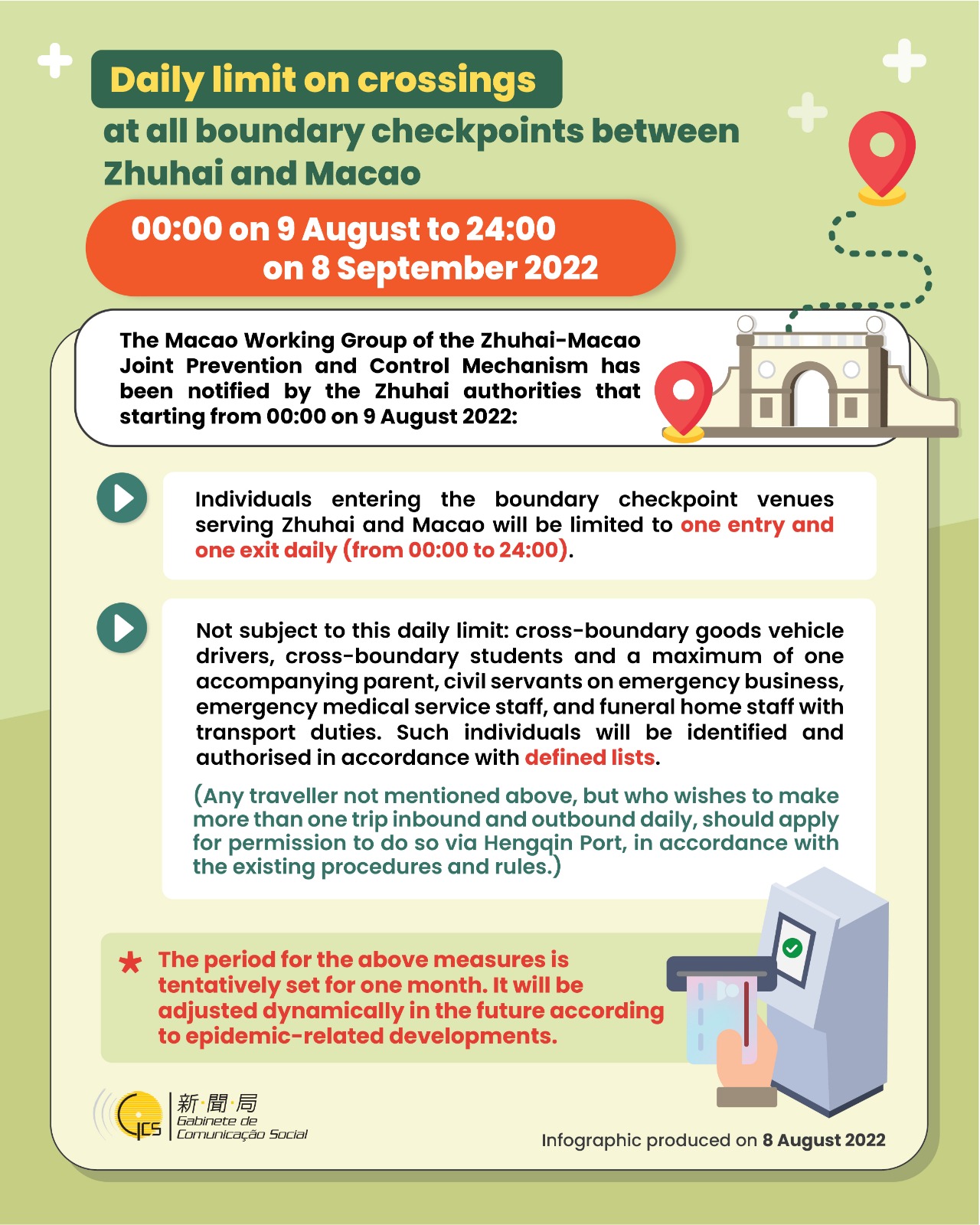 • [Infographic] Daily limit on crossings at all boundary checkpoints between Zhuhai and Macao 00:00 on 9 August to 24:00 on 8 September 2022