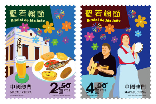 This issue includes a set of two stamps and one souvenir sheet. The stamps, with bright and vivid colours, illustrate the Feast of Saint John held at Calçada da Igreja de São Lázaro, the Portuguese-style building with colourful flags, food and drinks, and musical performances, showing the Portuguese and Macanese cultures. The souvenir sheet highlights the statue of Saint John the Baptist placed at the Municipal Affairs Bureau, the image of Macao city in 1622 and the Victory Monument at Victory Garden, representing the origin of this festivity.