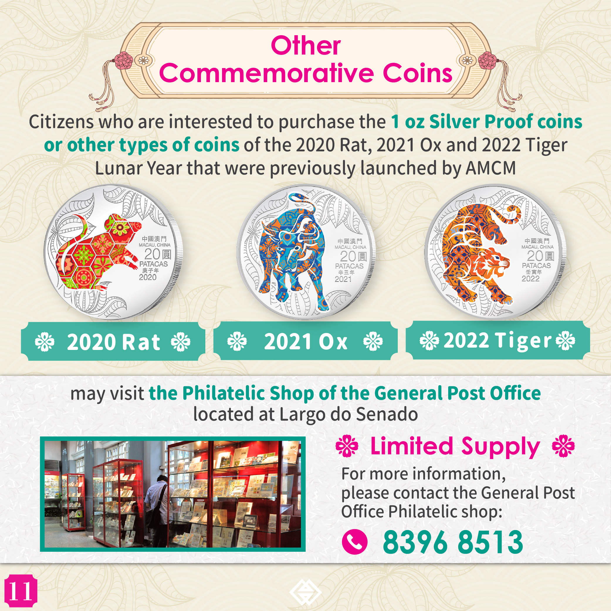 For further details relating to the online registration and subscription procedures, please refer to our webpage or call 28565071 / 28565072. Also, citizens who are interested to purchase the 1 oz Silver Proof coins or other types of coins of the 2020 Rat, 2021 Ox and 2022 Tiger Lunar Year that were previously launched by AMCM, may visit the Philatelic Shop of the General Post Office located at Largo do Senado. As supply of the coins is limited, please contact the General Post Office Philatelic shop for more information (Tel.: 83968513).
