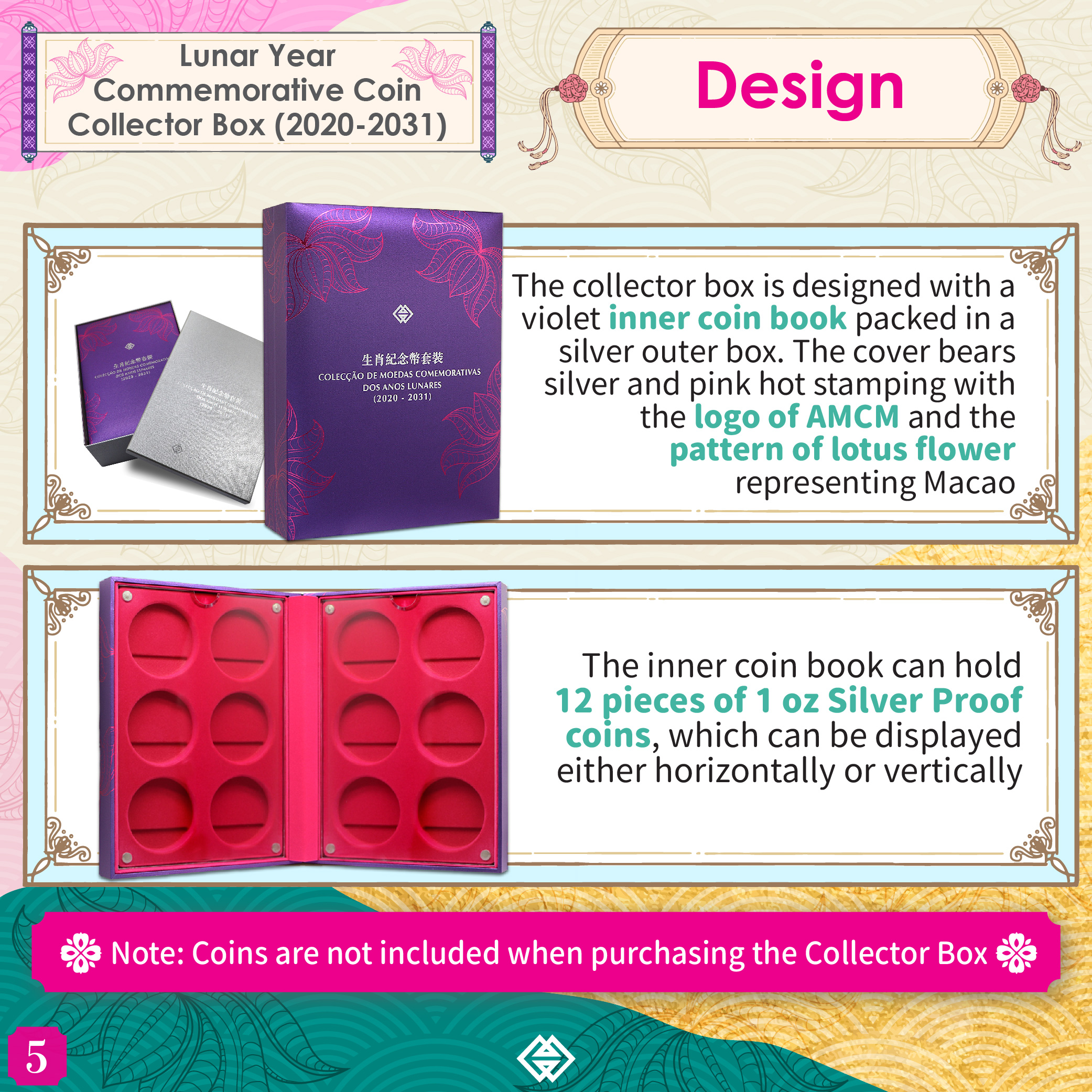 The collector box is designed with a violet inner coin book packed in a silver outer box. The cover is stamped in silver and pink hot stamping with the logo of AMCM and the pattern of lotus flower representing Macao. The inner coin book can be displayed either horizontally or vertically. The selling price of each collector box is MOP 530.