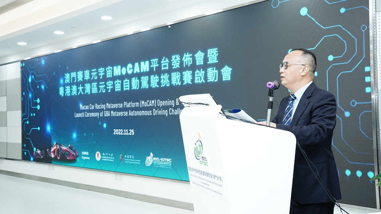 The University of Macau (UM) State Key Laboratory of Internet of Things for Smart City (SKL-IOTSC) and Faculty of Science and Technology (FST) today (25 November) held an inauguration ceremony for the Macao Car Racing Metaverse (MoCAM) Platform cum an opening ceremony for the Guangdong-Hong Kong-Macao Greater Bay Area Metaverse Autonomous Driving Challenge. During the event, which combined both virtual and in-person elements, a metaverse-based platform that allows for the superimposition of real autonomous driving vehicles in simulated scenarios was demonstrated. The platform is expected to promote the research and development of new autonomous driving technologies and provide an ideal experimental environment for autonomous driving competitions, laying the ground for the development of e-sports and diversified tourism in Macao.