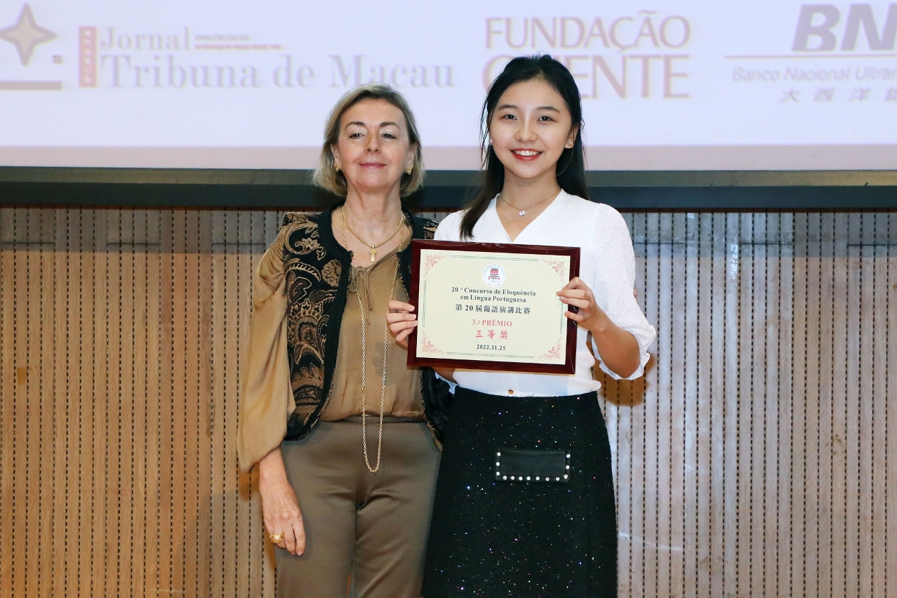This year, Cheang Pak In, a student of law at UM, won the first prize and the prize was awarded by the Macao Foundation. Chan Sio Kuan, a student of Portuguese studies at UM, won the second prize and the prize was awarded by Macau Tribune Journal and the National Overseas Bank (Banco Nacional Ultramarino). Xue Wenyu, an exchange student in the Department of Portuguese at UM this semester, won the third prize and the prize was awarded by the Orient Foundation. In addition, all participants in the competition received souvenirs sponsored by the Macao Post and Telecommunications Bureau and Macao Government Tourism Office.