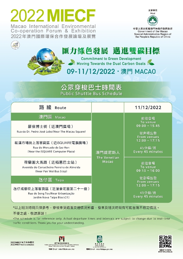 The last day of the event (11 December) will be Green Public Day. It will be open to the public for free entry. A series of environmental protection promotion and education activities will be staged during the 2022MIECF to raise public awareness of environmental protection and encourage the public to take the initiative to protect the environment. Four electric shuttle bus routes will be provided between Central Macao, Northern Macao, and Taipa and the MIECF venue on the Green Public Day to encourage the public to travel green.