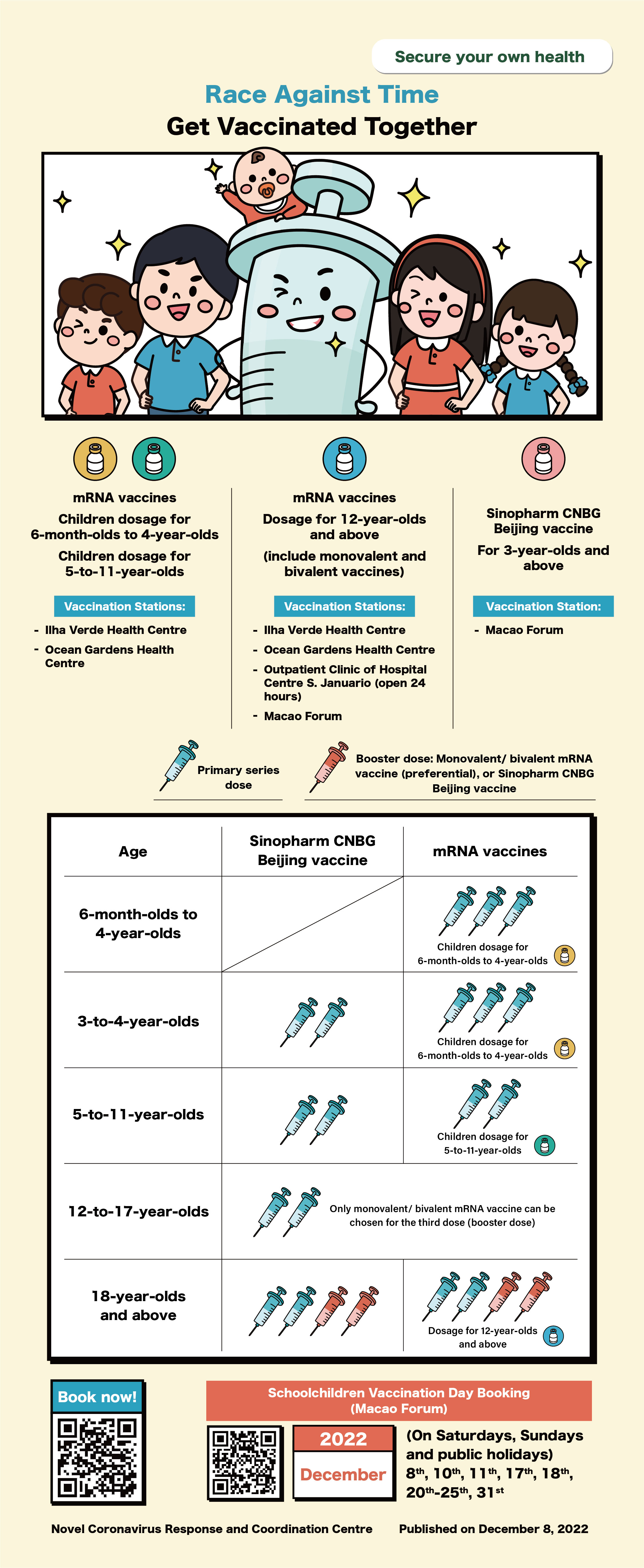 In order to cope with the changes of COVID-19, be responsible for schoolchildren’s health and race against time to fight the disease, there is an urgent need for having schoolchildren vaccinated. The Education and Youth Development Bureau (DSEDJ) and the Health Bureau continue to promote COVID-19 vaccination for schoolchildren in order to reduce the risk of severe illness and death. Through vaccination outreach programmes, schoolchildren can be vaccinated in school, or during the special vaccination sessions in the community, “Schoolchildren Vaccination Day” in Macau Forum at weekends and in the holidays. It is convenient for parents to vaccinate their schoolchildren who have not been given vaccination against COVID-19.