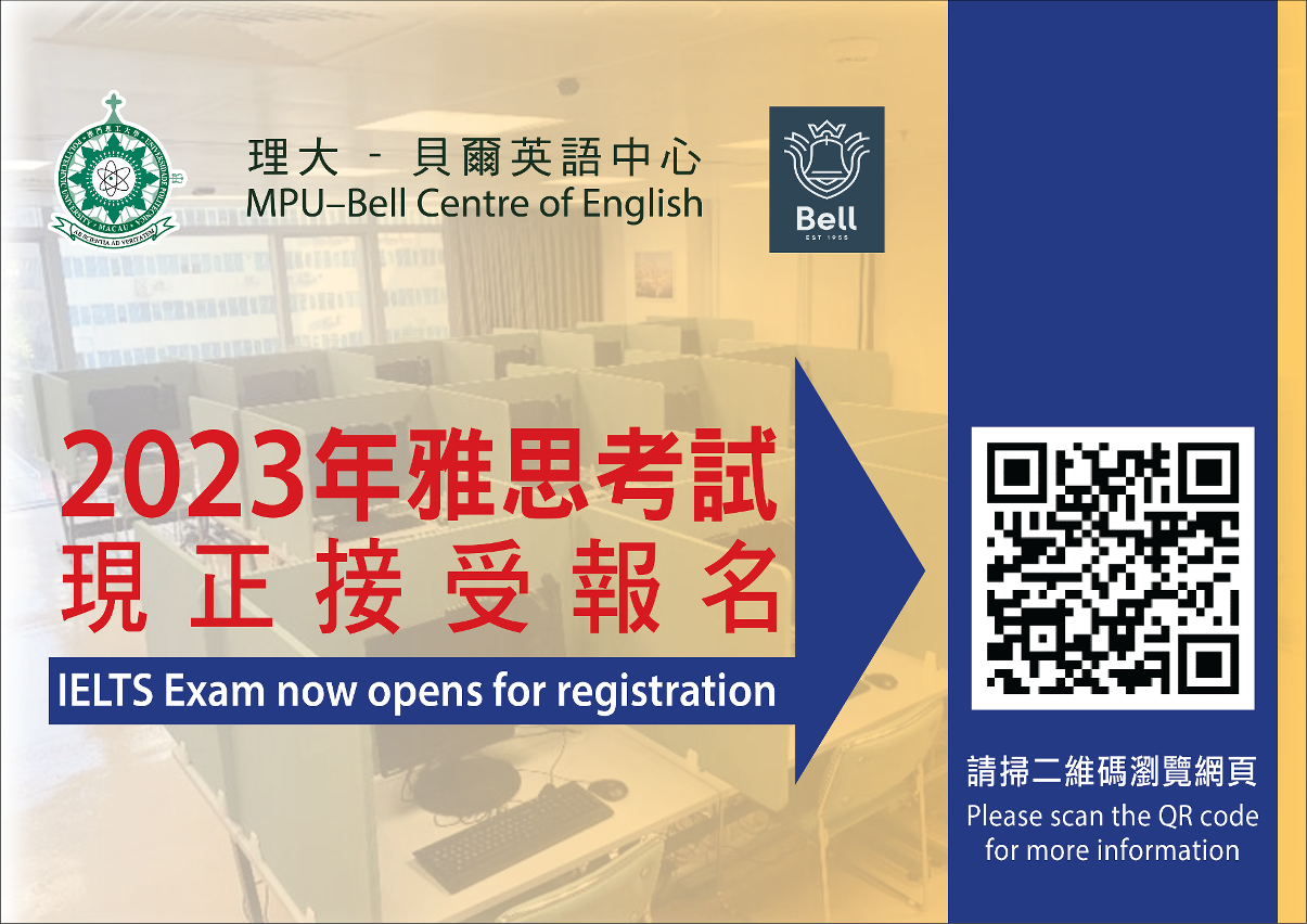 The Bell Centre of English of Macao Polytechnic University (MPU-Bell) was the first to offer the IELTS test in Macao. It locates in the centre of Macao and is easily accessible by public transport. IELTS test will be scheduled between Feb to June, for a total of 40 sessions, for the first half of 2023. Interested applicants can register through the website of the British Council (Hong Kong): https://ieltsregistration.britishcouncil.org/test-chooser, and select "MPU-BELL - Macao Polytechnic University " as the examination location. Local students can also apply for subsidies of “Continuing Education Development Plan” (DSEDJ). To comply with the anti-epidemic guidelines of the Macao SAR Health Bureau, the candidates must wear masks and have body temperature taken, and present a valid personal health code in green.