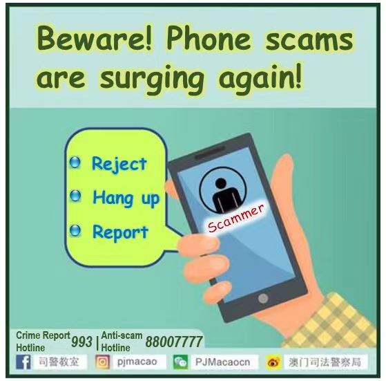 As phone scams are on the rise, PJ again issues a police circular to warn the public to take extra precautions and help spread anti-fraud information. Should they encounter phone scam, remember the three rules: “reject”, “hang up”, and “call”.