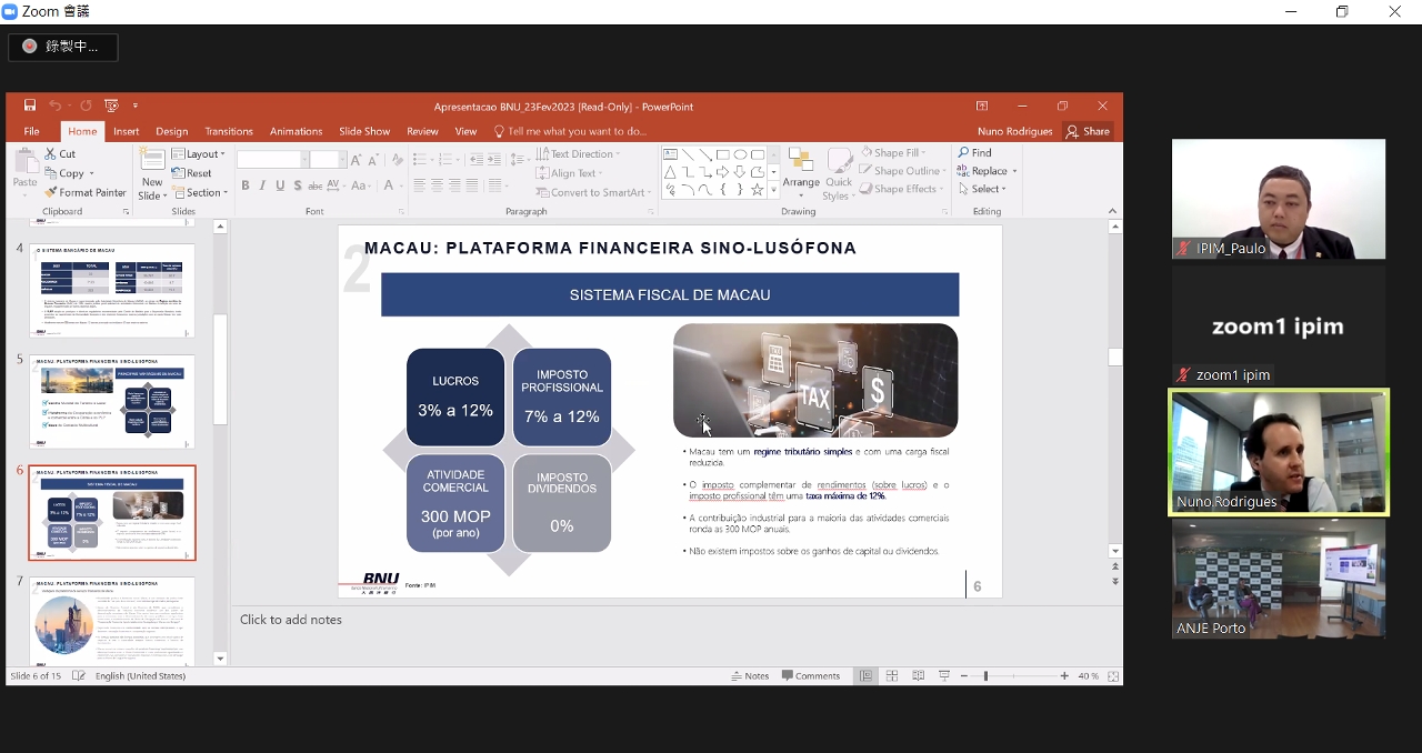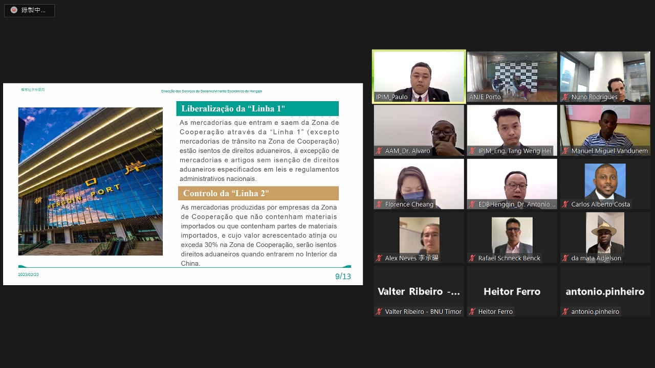 In order to promote Macao and Guangdong-Macao In-Depth Co-operation Zone in Hengqin to overseas markets and to leverage the function of Macao’s China-Portuguese-speaking countries platform, the Macao Trade and Investment Promotion Institute (IPIM) and the Portugal-China Young Entrepreneurs Association (AJEPC) jointly organised the “Join Macao, Seize PSCs Opportunities” Online Investor Presentation Session on 23 February. The event was held online and offline in both Macao and Portugal, during which representatives from the Economic Development Bureau of Guangdong-Macao In-Depth Co-operation Zone in Hengqin made a themed presentation. The event attracted over 30 enterprises.