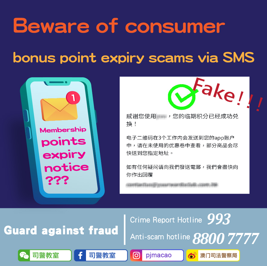 The Judiciary Police (PJ) has again received reports of smishing through false consumer bonus point expiry notifications. A member of the public recently received a text message from an unknown sender, claiming that the bonus points in his account on a consumer platform would soon expire. He should click the embedded link in the text message to redeem rewards. Upon doing so, the victim reached a phishing website where he was required to enter his personal information and credit card details. To redeem rewards, the victim had to enter a one-time verification code to complete a credit card transaction. The following day, the victim discovered someone had linked his credit card to a mobile payment app and had conducted multiple large-sum transactions.