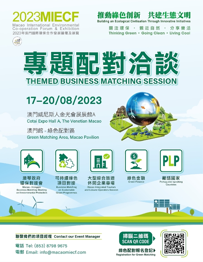 Traders interested in participating in Green Matching can now register their matching needs by scanning the QR code on the attached poster or logging in to https://www.macaomiecf.com/miecf2023/event/green_matching. The event will pair the traders with suitable partners and arrange on-site meeting based on their preferences. A professional translation service will be available at the event venue, and personnel will offer consulting and other supporting services on-site in the Green Matching Area if required.