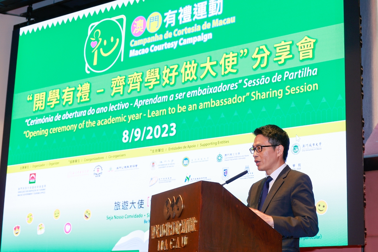 The “Macao Courtesy Campaign: Opening ceremony of the academic year - Learn to be an ambassador” Sharing Session was organized by MGTO and co-organized by Chinese Educators’ Association of Macau, Macao Catholic Schools Association and Macao Civil Service Educational Association. The supporting entities include the University of Macau, Macao Institute for Tourism Studies, Macao Polytechnic University, Academy of Public Security Forces, City University of Macau, University of Saint Joseph, Kiang Wu Nursing College of Macau, Macau University of Science and Technology, Macau Institute of Management and Macau Millennium College.