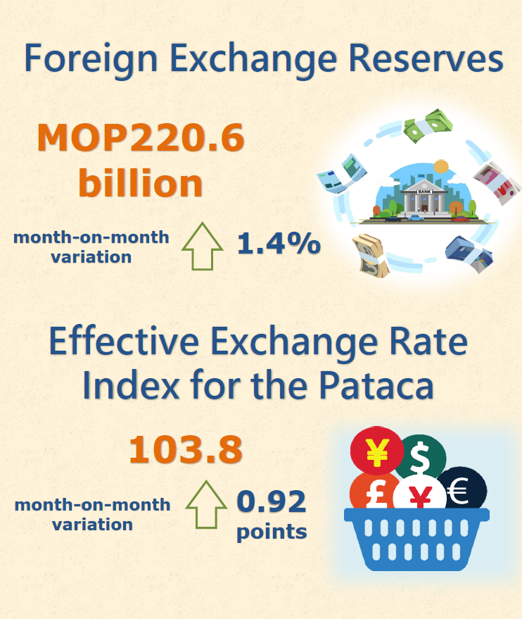 The Monetary Authority of Macao announced today (14 September) that the preliminary estimate of Macao SAR’s foreign exchange reserves amounted to MOP220.6 billion (USD27.30 billion) at the end of August 2023. The reserves increased by 1.4% from the revised value of MOP217.4 billion (USD27.07 billion) for the previous month. Macao SAR’s foreign exchange reserves at end-August 2023 represented 11 times the currency in circulation or 88.0% of pataca M2 at end-July 2023.