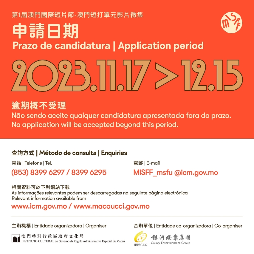 The relevant programme regulations and application form can be obtained from IC’s website at www.icm.gov.mo or the Macao Cultural and Creative Industries Website at www.macaucci.gov.mo. Applicants can submit the application form together with the required documents to the Cultural Affairs Building located at Tap Siac Square, Macao, on or before 5:45pm on 15 December, or email the scanned application documents to MISFF_msfu@icm.gov.mo (the size of the email should be lower than 10MB in size, and a download link can be attached if necessary) on or before 23:59 on 15 December.
