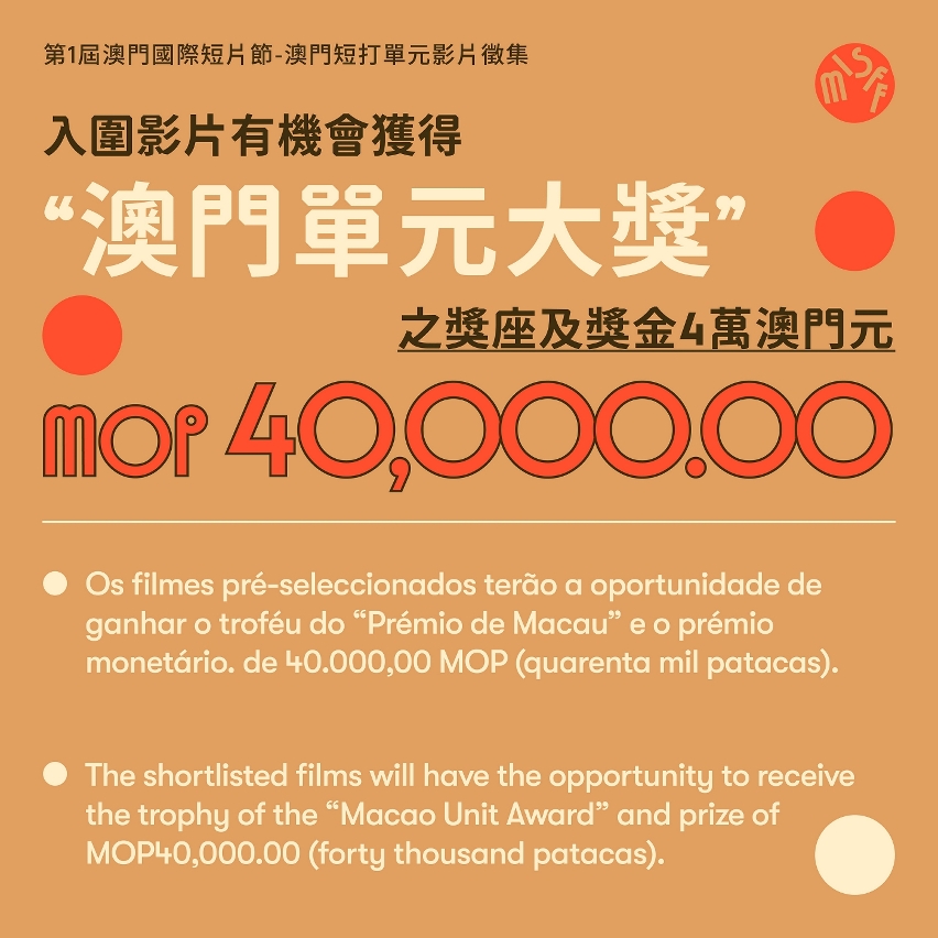 The “Macao International Shorts Film Festival” will be held in 2024, featuring an opening ceremony and opening screenings, screening activities, workshops, seminars, as well as a closing and award ceremony. The screenings will be divided into three sections, namely “Macao Short Film”, “Emerging Short Film” and “Filmmaker in Focus”. In addition, the sessions will feature the participation of senior filmmakers whom will form a jury, and will host thematic workshops and seminars, in order to create an international platform for exchange and screenings of short films, and to actively promote local film and television productions. Therefore, IC is now calling for the submission of Macao short films for “The 1st Macao International Shorts Film Festival”. The submitted proposals will be evaluated by the organising committee of the Macao International Shorts Film Festival. Shortlisted works will be screened at the section “Macao Short Film” of “The 1st Macao International Shorts Film Festival” and will compete for the “Macao Unit Award”. The winners will be awarded a trophy and a prize in the amount of MOP40,000.