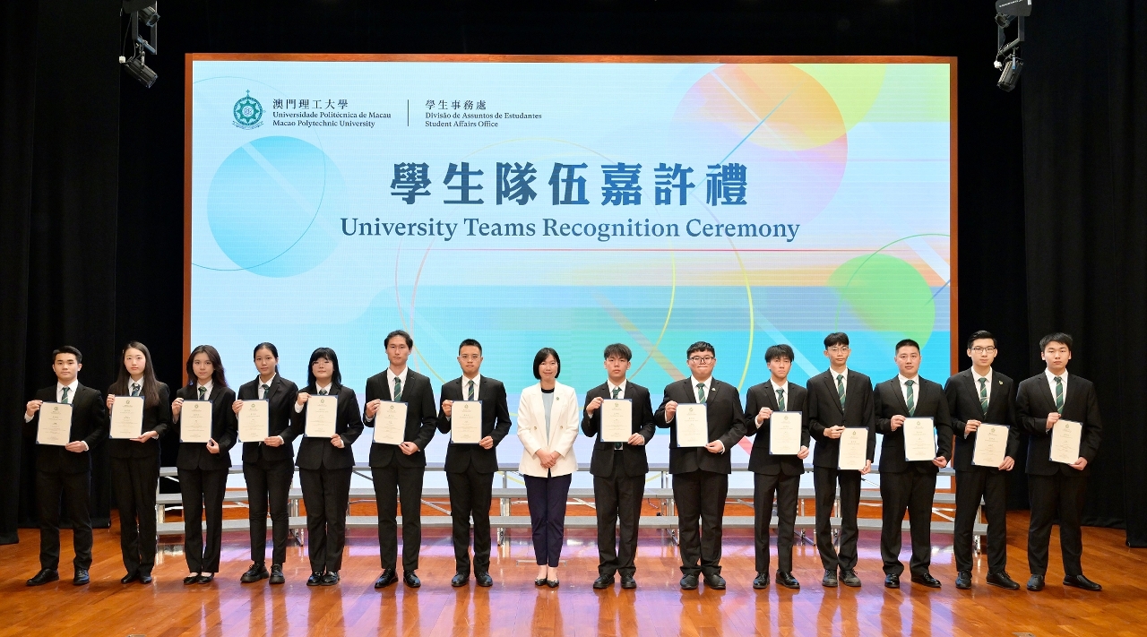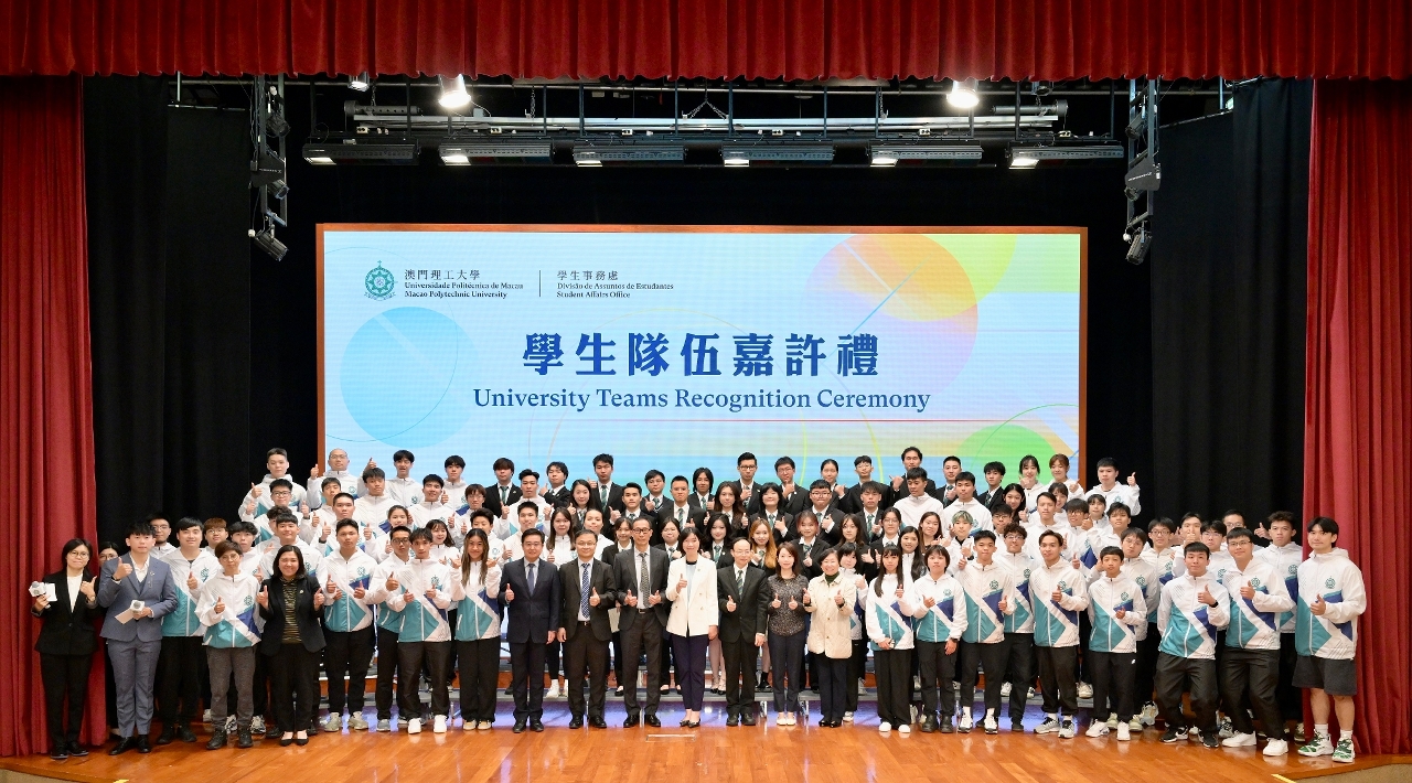 In recognition of outstanding team members from the University Teams at Macao Polytechnic University (MPU) and to encourage students’ active participation in various competitions and activities, MPU held the “2023 University Teams Recognition Ceremony” on November 15th in the university Auditorium. Vice-Rector of MPU, Dr. Lei Ngan Lin, and Deans from various faculties attended the event and presented recognition certificates to the University Teams. As MPU continues to cultivate well-rounded professional talents, it also strives to enhance students’ patriotism and comprehensive qualities, cultivating more outstanding talents for the country and Macao. Over 200 people attended the recognition ceremony, creating a joyful and heartwarming atmosphere.