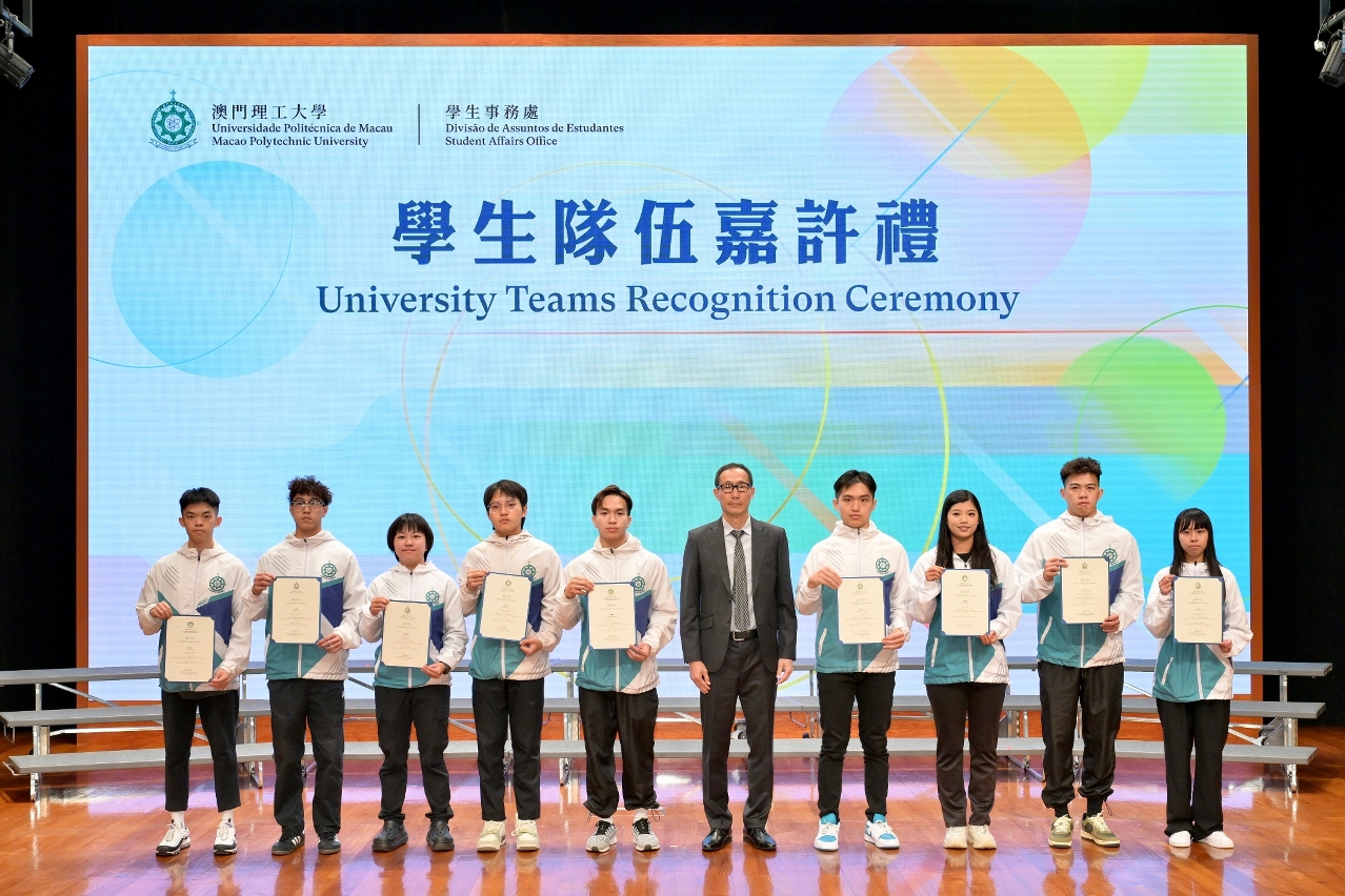 Recognition certificates were presented to outstanding members of the national flag team, sports teams, and cultural and artistic teams, including Dragon Boat Team, Track and Field Team, Basketball Team, Volleyball Team, Handball Team, Badminton Team, Table Tennis Team, Football Team and Debate Team. The MPU University Teams receive professional training, participate in both local and international competitions every year, and continue to make remarkable achievements. Distinguished guests attending the recognition ceremony included Acting Dean of the Faculty of Applied Sciences, Dr. Lam Chan Tong; Dean of the Faculty of Health Sciences and Sports, Dr. Ng San Fan, and Associate Dean Dr. Lam Nogueira Oi Ching; Acting Dean of the Faculty of Languages and Translation, Dr. Zhang Yunfeng; Associate Dean of the Faculty of Humanities and Social Sciences, Dr. Wong Un In; Dean of the Faculty of Business, Dr. Huang Guihai; and Head of the Student Affairs Office, Ms. Lao Weng Ian.