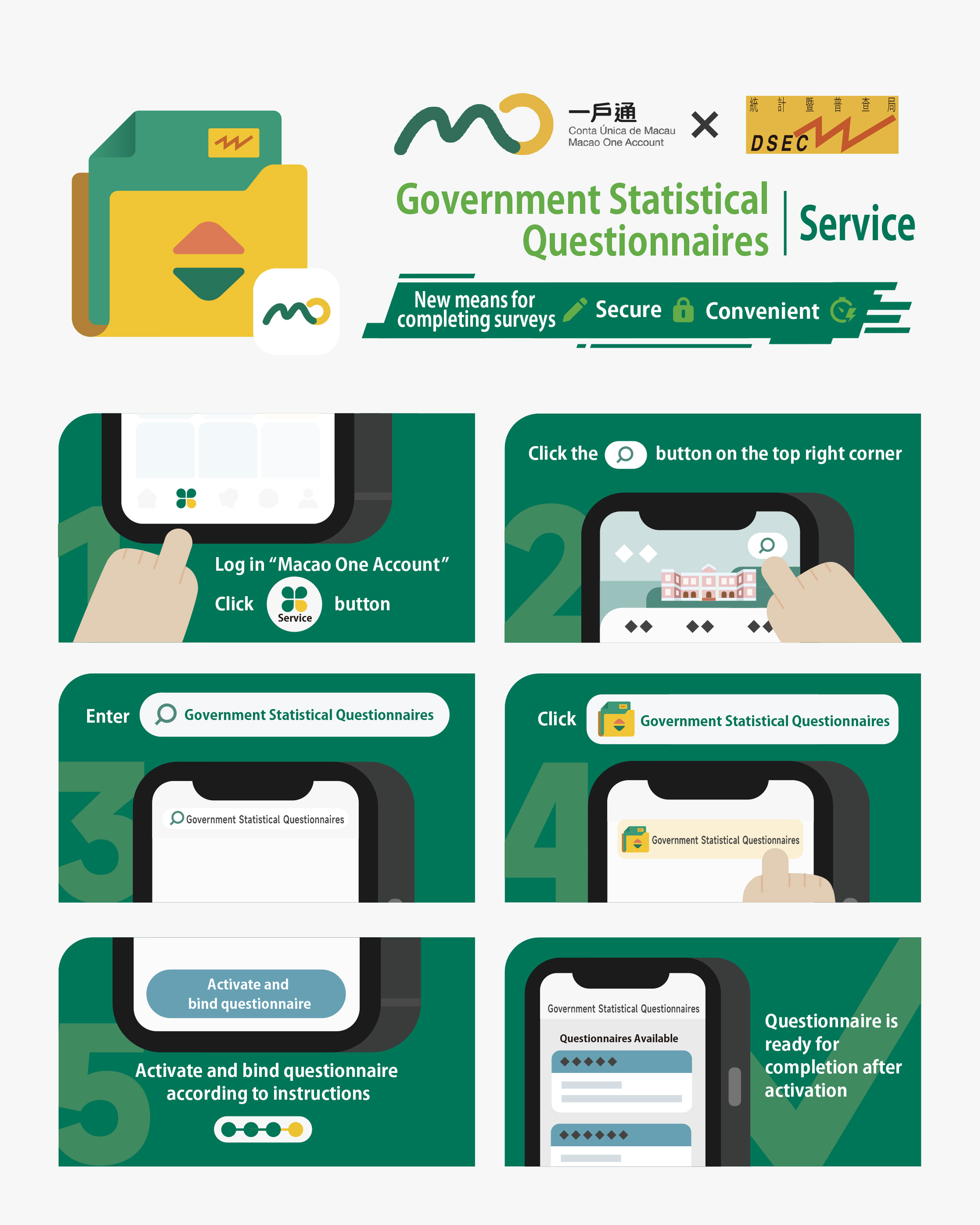 DSEC continues to enhance and optimise its e-services, striving to provide the public with quality statistical services. For more information on the “Government Statistical Questionnaires” service, please refer to the promotional materials on the DSEC website ( https://www.dsec.gov.mo/en-US/Service/Respondent ).