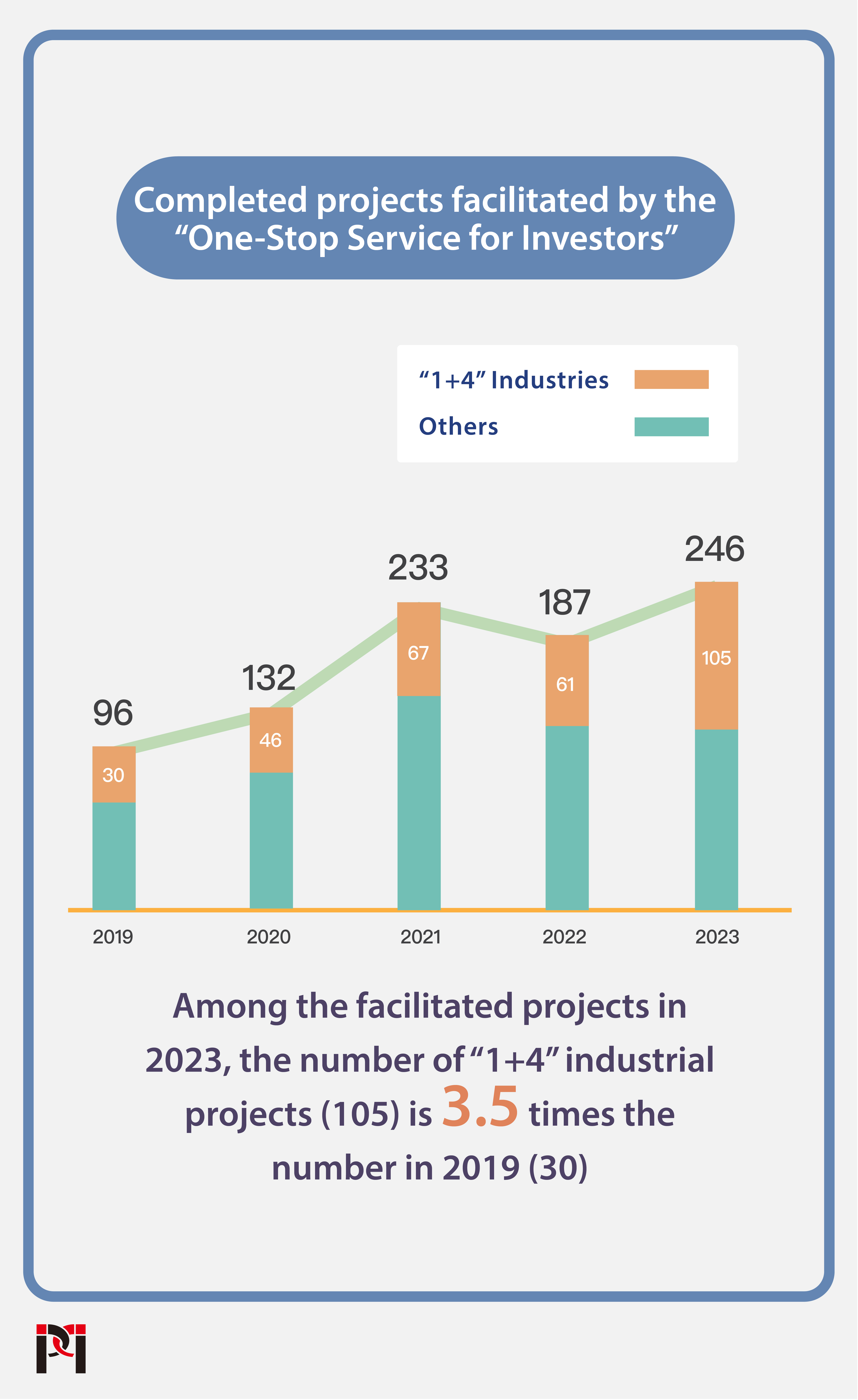In response to the ever-changing market and the industrial environment and in accordance with “1+4” industrial orientation, IPIM has implemented a number of optimisation measures on its Investor’s “One-Stop Service” in recent years, such as the refinement of the cross-departmental mechanism of the “Investment Committee”, and the establishment of the “Prior Technical Meeting 2.0” in 2022 to co-ordinate the relevant departments and give priority to the projects of four major industries. At present, the “Investment Committee” is composed of representatives from 13 departments and institutions, which have basically covered all “1+4” industry-related departments, and can assure the capacities to facilitate the implementation of key projects in the “1+4” industries. In recent years, IPIM has made great efforts in strengthening the two-way linkage between exhibitions and investment promotion, giving full play to the “Industry + MICE” pattern. In the MICE activities hosted/co-ordinated by IPIM, the services oriented in “pre-event positioning, throughout-event follow-up and post-event tracking” for the investors have been offered to convert exhibition visitors into investors.