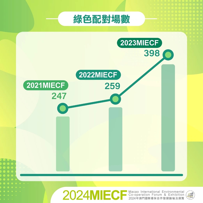To foster green co-operation and consolidate the new “industry + MICE” development model, the Macao International Environmental Co-operation Forum & Exhibition (MIECF) has established a platform for international environmental exchanges and co-operation for exhibitors and trade visitors at home and abroad through Green Matching. In 2023, 398 business matching sessions took place during the exhibition period, representing a 13% increase from 2019 when COVID pandemic had not yet hit the city. This year, MIECF will again host themed business matching sessions on Macao-Hengqin Synergy Business Matching on Environmental Protection, SME Environmental Procurement from Integrated Tourism and Leisure Enterprises, Big Health Green Supply Chain, Green Technology and Carbon Trading, and International Green Energy, to promote the green and low-carbon development and transformation of the “1+4” key industries and to leverage MIECF’s role as an international professional platform for environmental protection.