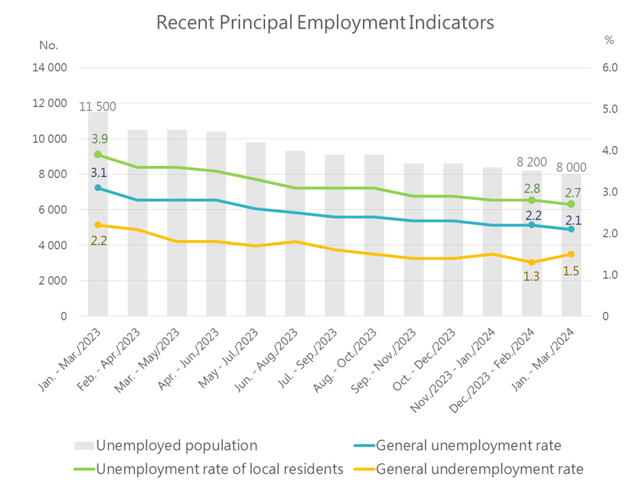 In terms of three consecutive months, both the general unemployment rate (2.1%) and the unemployment rate of local residents (2.7%) for January - March 2024 decreased by 0.1 percentage point from the previous period (December 2023 - February 2024). On the other hand, the underemployment rate (1.5%) increased by 0.2 percentage points. Total employment (371,100) rose by 300 from the previous period, whereas employed residents (284,000) dropped by 300.