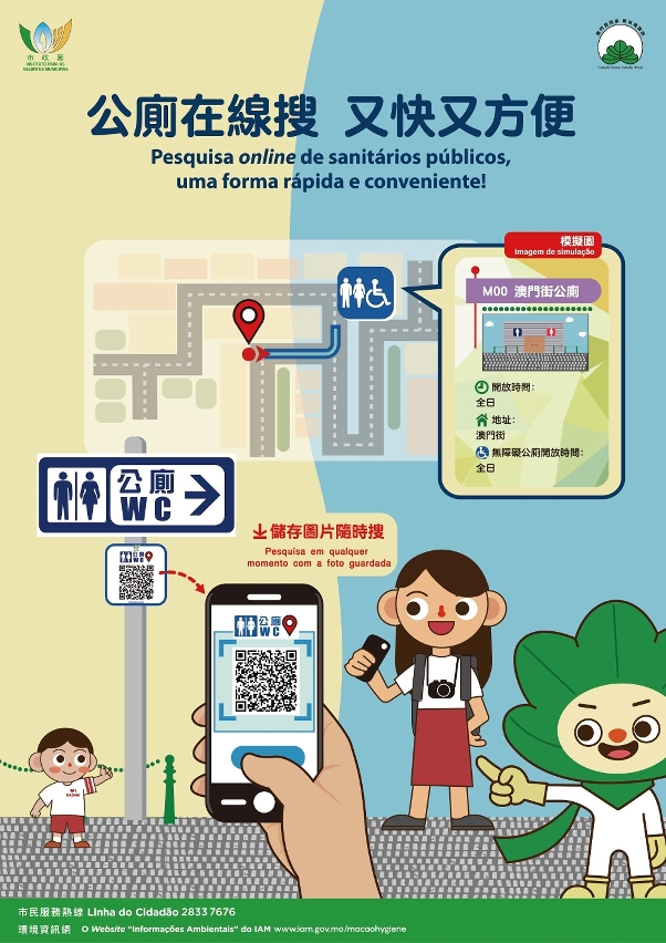 In addition, IAM has installed more than 200 signposts indicating the direction of public toilets in the various districts of Macao. The public and tourists can use their mobile phones to scan the “EasyGo Public Toilet Navigation” QR code on the signposts to immediately use the navigation function to get to the nearest public toilet. They can also save the QR code and scan it for use anytime.